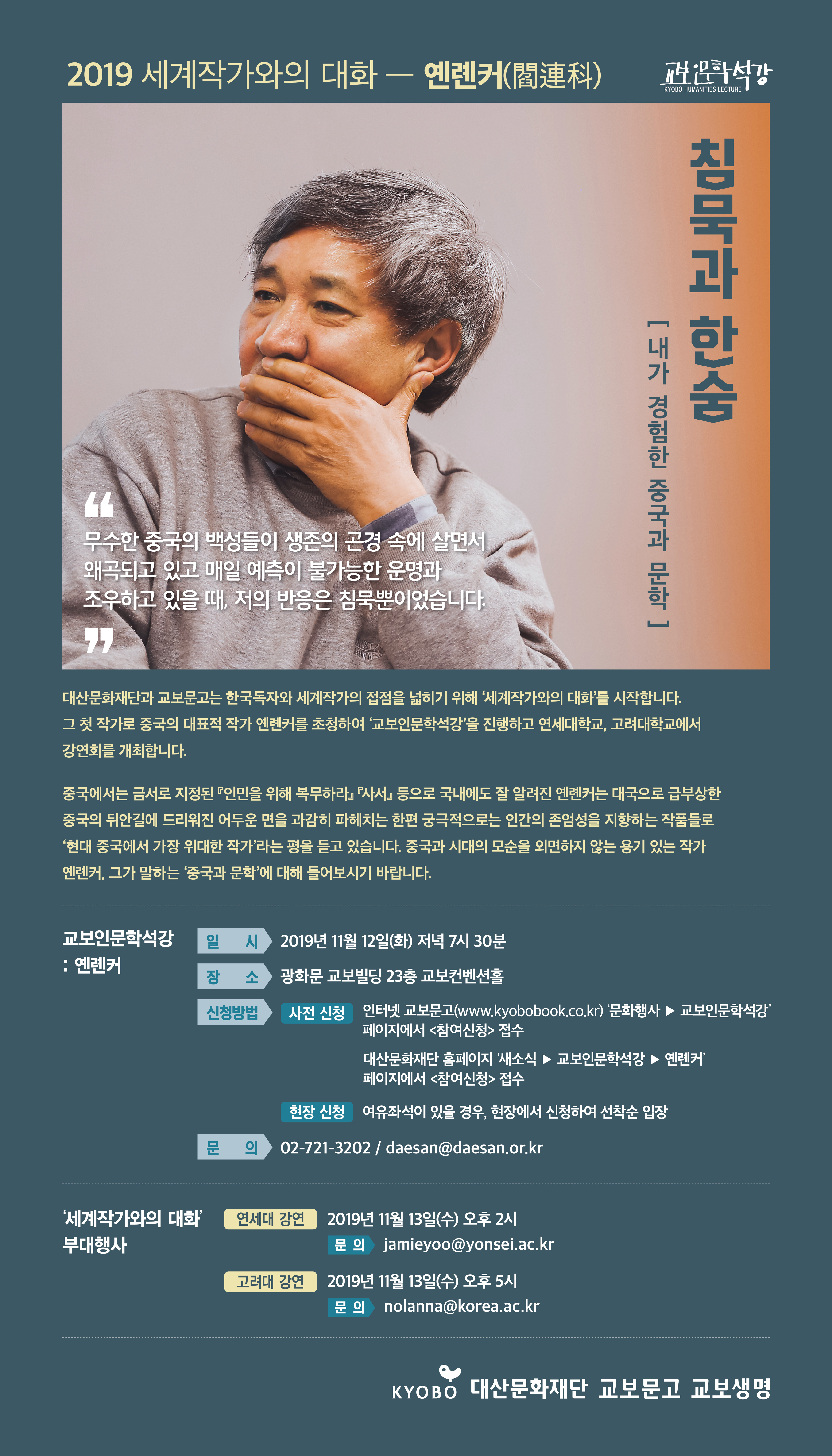 문학 관련 공익사업을 펼치고 있는 대산문화재단에서 오는 11월 12일(화) 저녁 7시 30분, 광화문 교보빌딩23층 교보컨벤션홀에서 옌롄커 작가를 초청하여 강연을 진행합니다. 이번 강연회는 350석 규모로 매회 무료참가로 진행되며, 참가 신청은 교보문고와 대산문화재단 홈페이지를 통해 하실 수 있습니다.
