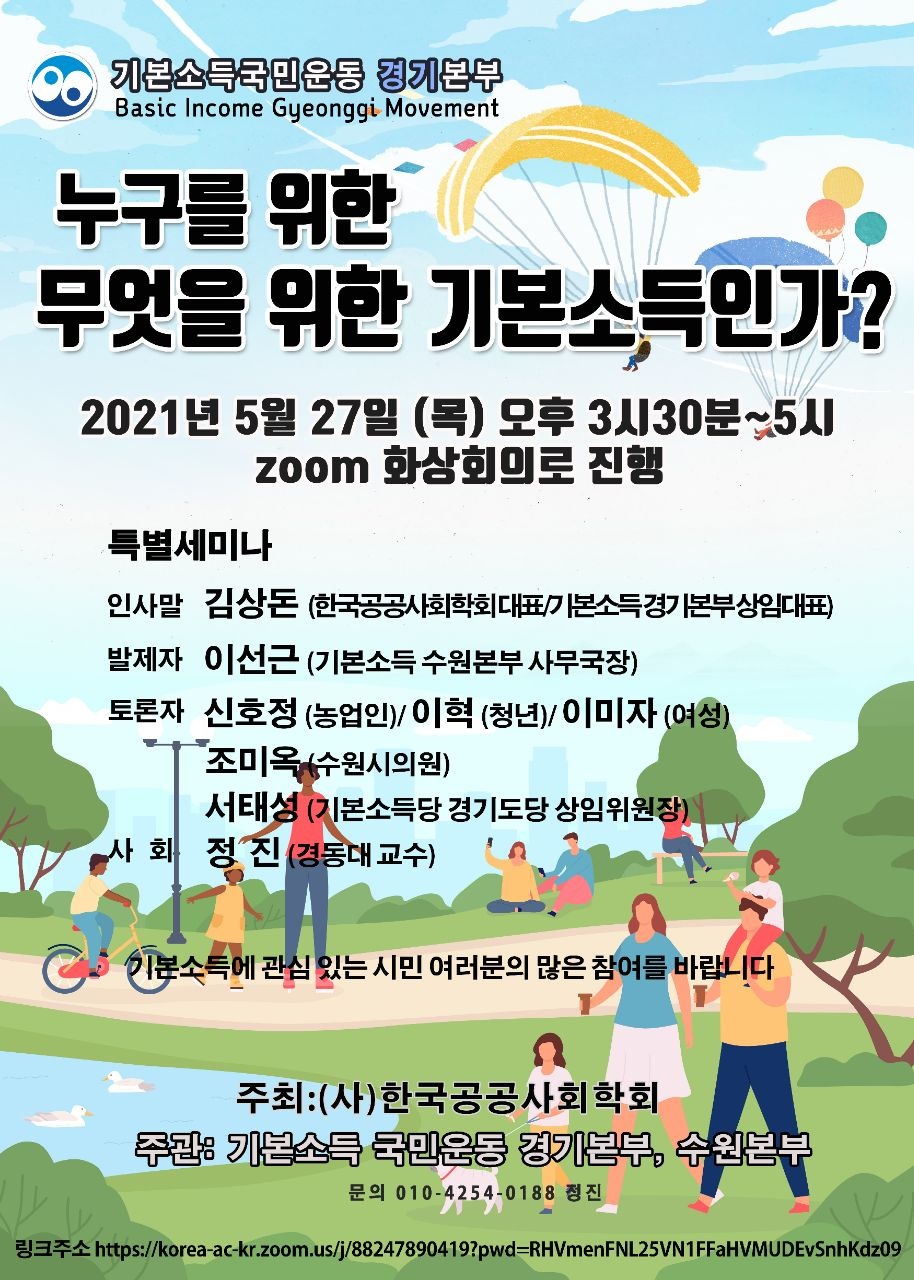 (사)한국공공사회학회와 기본소득 국민운동경기본부, 수원본부는 2021년 5월 27일(목) '누구를 위한, 무엇을 위한 기본소득인가?' 주제로, 기본소득 시민특별세미나를 개최합니다. 이번 세미나에서는 기본소득에 대한 개념, 필요성, 재원 마련방안에 대해 성찰하고 소통, 공감할 수 있는 공공성의 場이오니 부디 참석하셔서 여러분의 소중한 제언과 훌륭한 고견을 나눠주시기를 바랍니다.