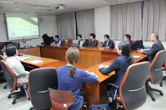 한국외국어대학교 러시아연구소 인문한국(HK) 연구사업단은 러시아연방 인문공간 연구의 일환으로 지난 10월 27일 금요일 서울캠퍼스 국제관 203호에서 러시아 상트페테르부르크국립대학교 동방학부 한국학과 교수이자 학제간한국학연구소 소장인 세르게이 쿠르바노프 교수를 초청하여 ‘러시아인이 바라보는 러시아 문학’이라는 주제로 간담회를 진행했다. 이 자리에는 한국외대 러시아연구소 연구진과 노어과 학생, 외부 손님 등 18명이 참석하여 러시아 문학에 관한 쿠르바노프 교수의 견해를 듣고 그에 관해 질의응답 시간을 가졌다.