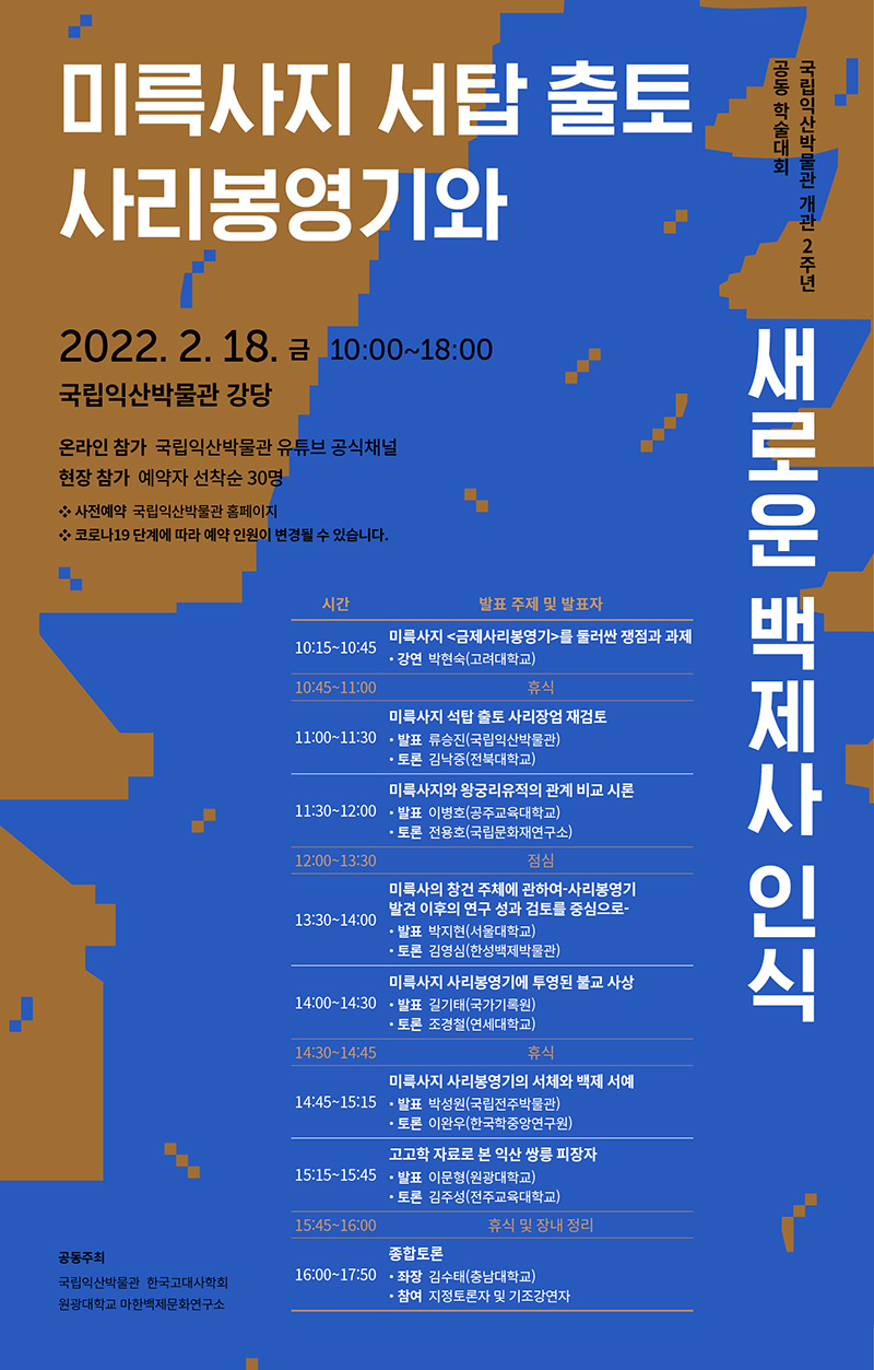 제      목 국립익산박물관 개관 2주년 공동 학술대회 '미륵사지 서탑 출토 사리봉영기와 새로운 백제사 인식'
