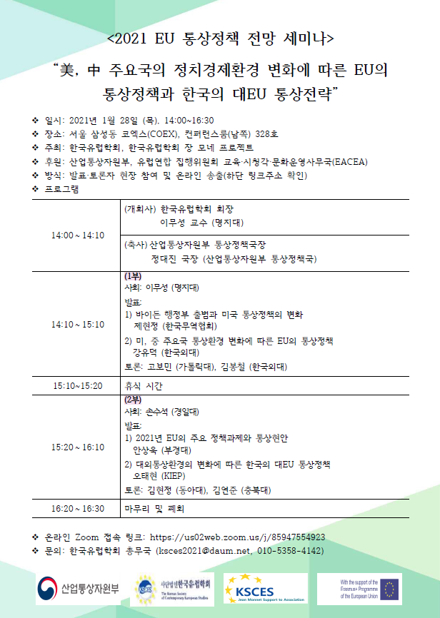 한국유럽학회와 한국유럽학회 장 모네 프로젝트팀은 지난 1월 28일 '미, 중 주요국의 정치경제환경 변화에 따른 EU 통상정책과 한국의 대 EU통상전략'이라는 주제로 세미나를 진행하였다. 본 행사는 산업통상자원부와 유럽연합집행위원회 교육시청각문화운영사무국의 후원을 받아 운영되었고, 발표자와 토론자는 현장참여를 하였고, 회의 내용은 온라인으로 생중계로 송출 되었습니다.