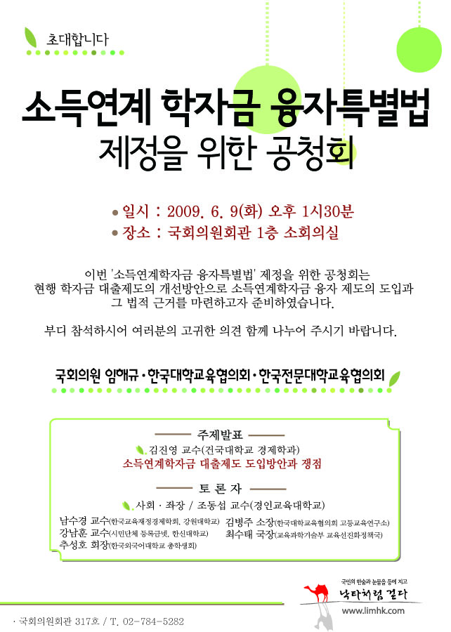소득연계학자금 융자특별법 제정을 위한 공청회 개최 안내