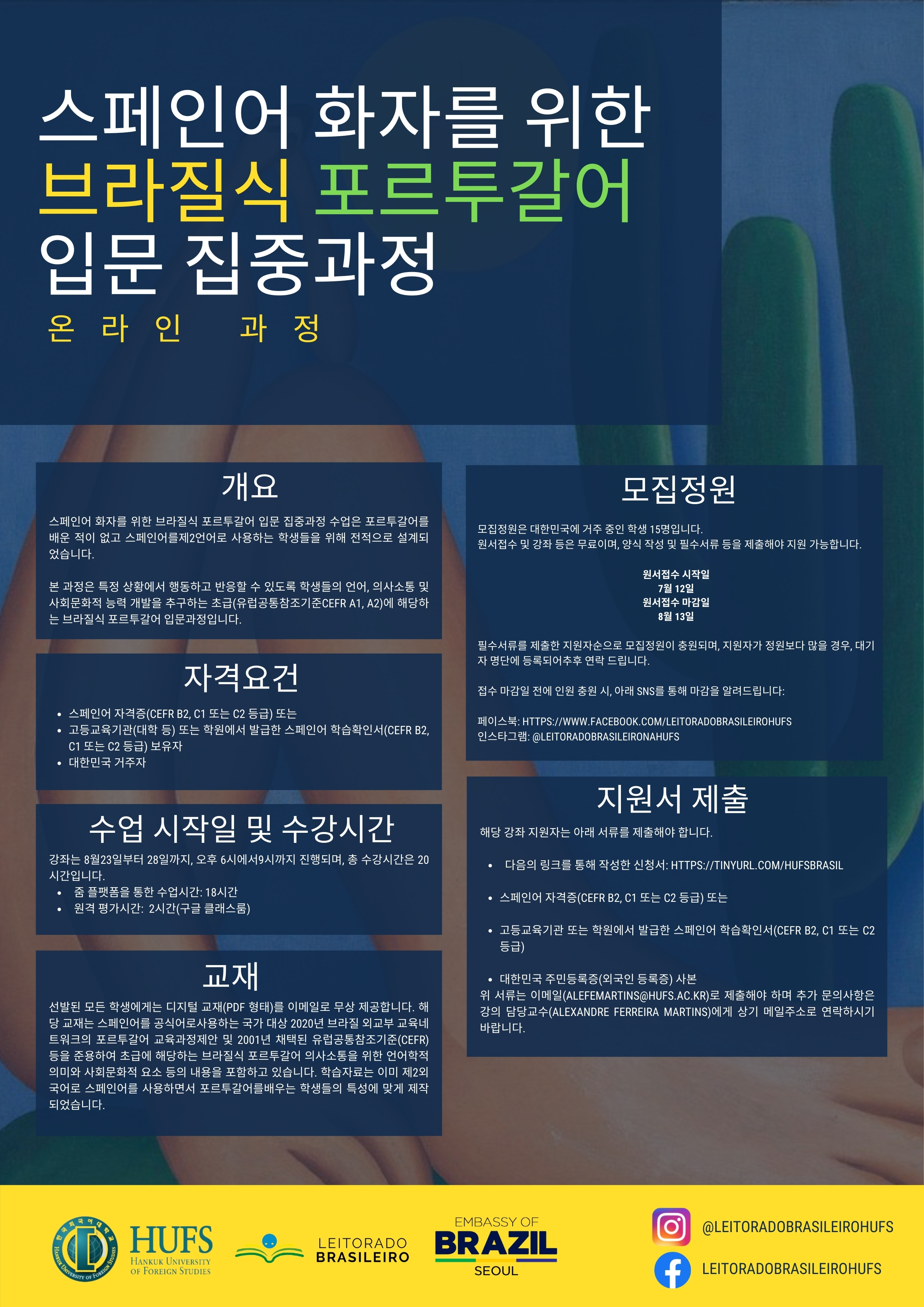 한국외국어대학교 포르투갈어과는 주한 브라질대사관과 공동으로 2021년 여름 방학에 스페인어 전공 학생을 대상으로 아래와 같이 브라질식 포르투갈어 입문 집중 과정 (온라인 과정)을 개설해 운영할 계획입니다. 관심있는 학생들의 많은 참여 부탁드립니다.