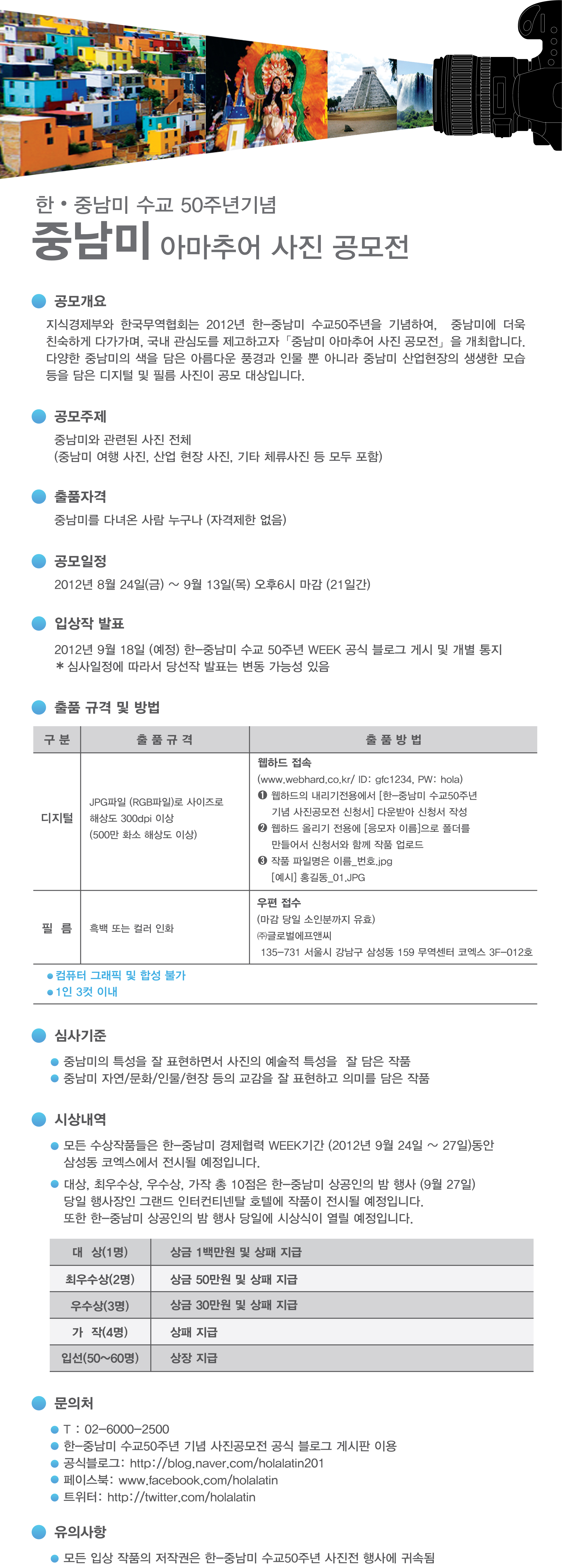한국무역협회가 주최하고 지식경제부와 외교통상부가 함께 한국-중남미 16개국 수교50주년(1962~2012) 기념하여, 한-중남미 WEEK 행사 기간동안 중남미 아마추어 사진전을 공모합니다.