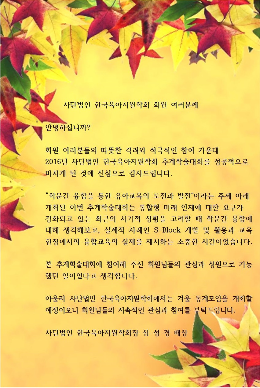 2016년 사단법인 한국육아지원학회 추계학술대회 감사의 글