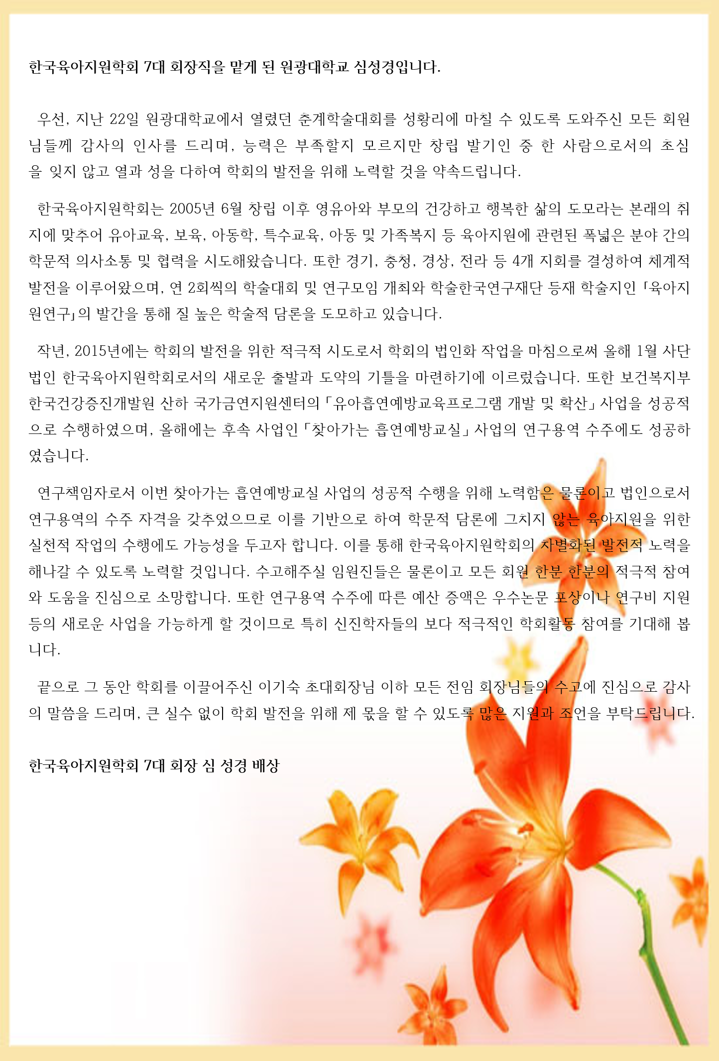 제 7대 심성경 학회장님 취임인사입니다