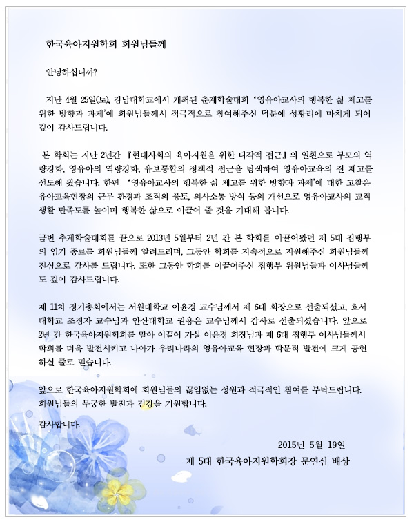 앞으로도 육아지원학회에 많은 관심과 성원을 부탁드립니다.