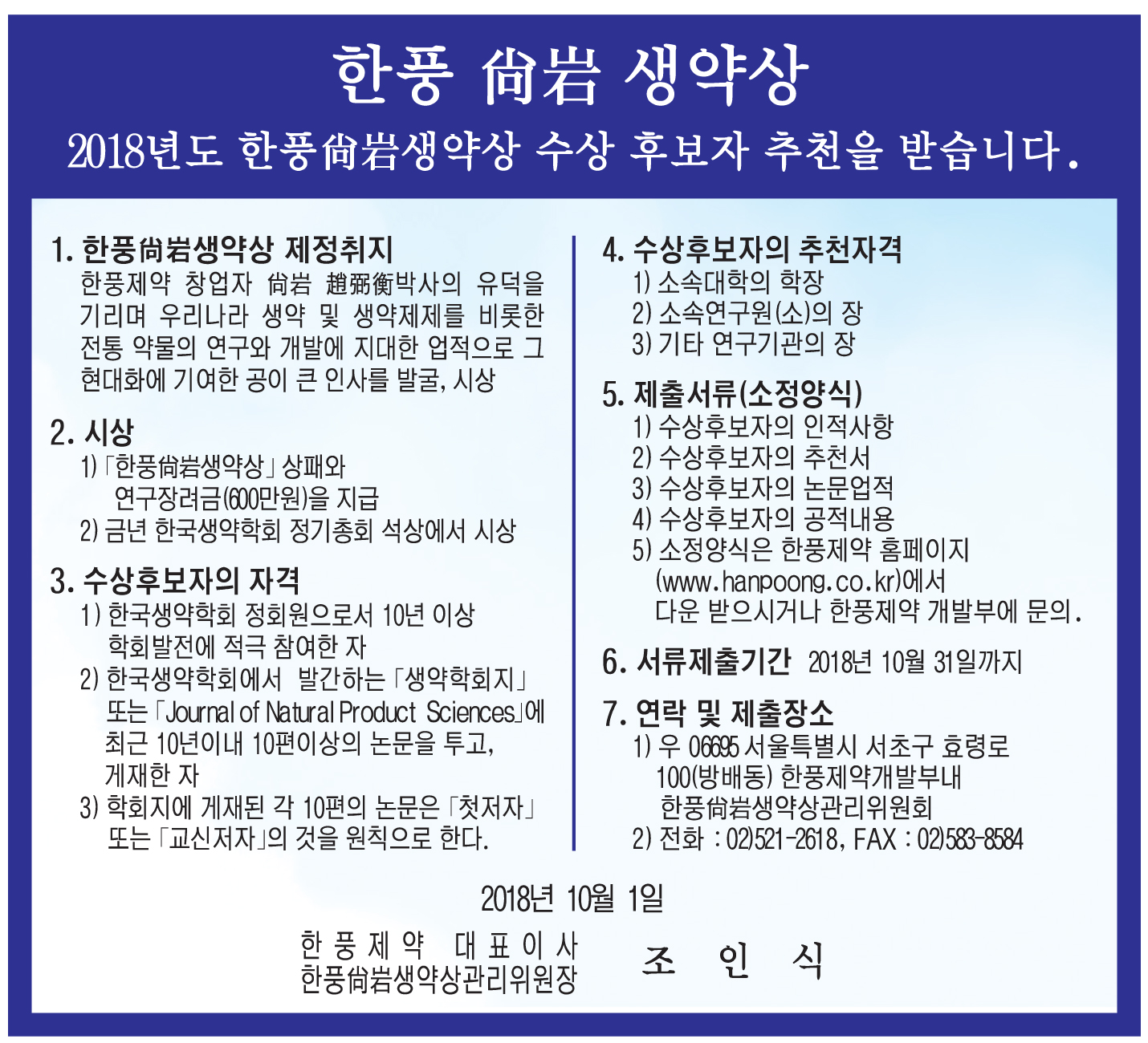 한풍제약의 「한풍尙岩생약상」의 숭고한 뜻을 이해해 주시고 참여와 협조를 부탁드리며,