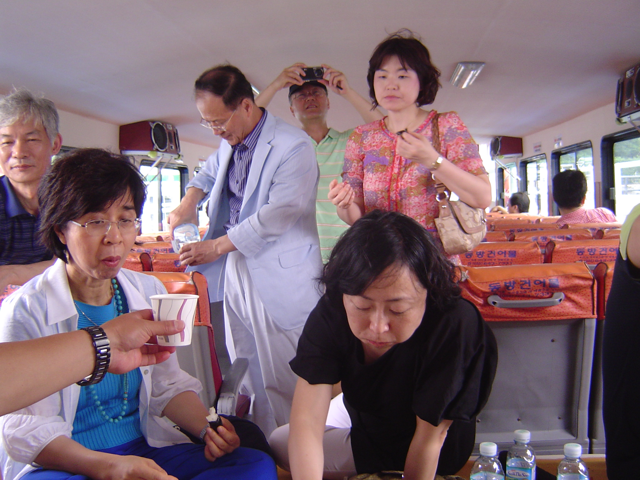이게 그 불법(?)의 현장이죠.^^* 한산도 갔다오는 배안에서 끓어오르는 비감함을 소주 한 잔으로 달래는 모습. 충무김밥 먹는 거 같죠? 물병도 배경으로 깔려 있고. 종이컵의 내용물이 심히 의심스럽습니다. <박의경 쌤: 어~, 이거 안되는디...>, <홍원표 쌤: 쎄 시봉~~~>, <김영수: 술파라치> <이종식 쌤: 일단 한 잔 하는거지, 뭐><문지영 쌤: 먹는 게 남는거여> <서희경쌤: 으음~충무김밥의 깊은 맛!!>