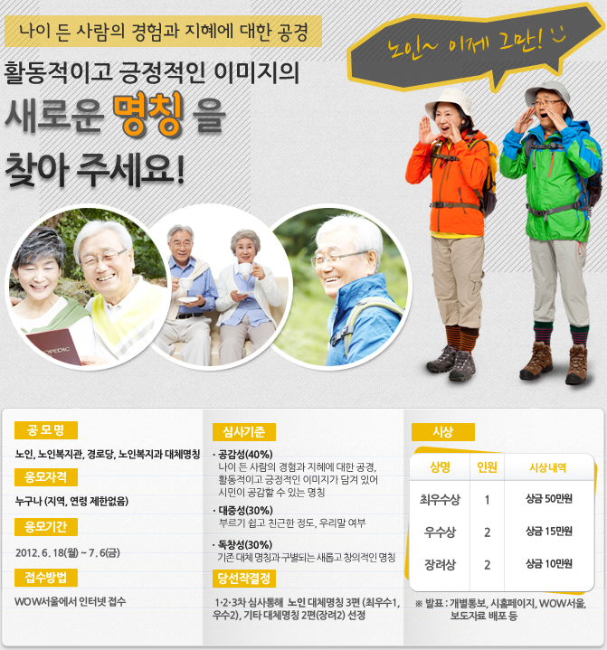 <''''노인'''' 대체 명칭 공모전> 나이 든 사람의 경험과 지혜에 대한 공경, 활동적이고 긍정적인 이미지의 새로운 명칭을 찾아 주세요! (2012-06-19)