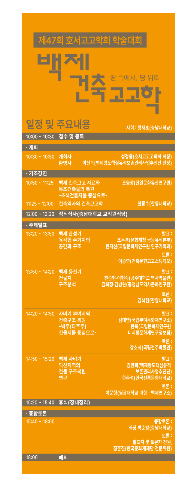 ▣ 후 원 : 경고고학연구소ㆍ고운문화재연구원ㆍ금강문화유산연구원ㆍ누리고고학연구소ㆍ대한문화재연구원ㆍ동방문화재연구원ㆍ마한문화연구원ㆍ미래문화재연구원ㆍ백제문화재연구원ㆍ비전문화유산연구원ㆍ서원문화재연구원ㆍ중앙문화재연구원ㆍ중원문화재연구원ㆍ충청남도역사문화연구원ㆍ충청문화재연구원ㆍ충청북도문화재연구원ㆍ한강문화재연구원ㆍ한국고고환경연구소ㆍ한국문화재재단ㆍ한국선사문화연구원ㆍ한얼문화유산연구원ㆍ호서문화유산연구원