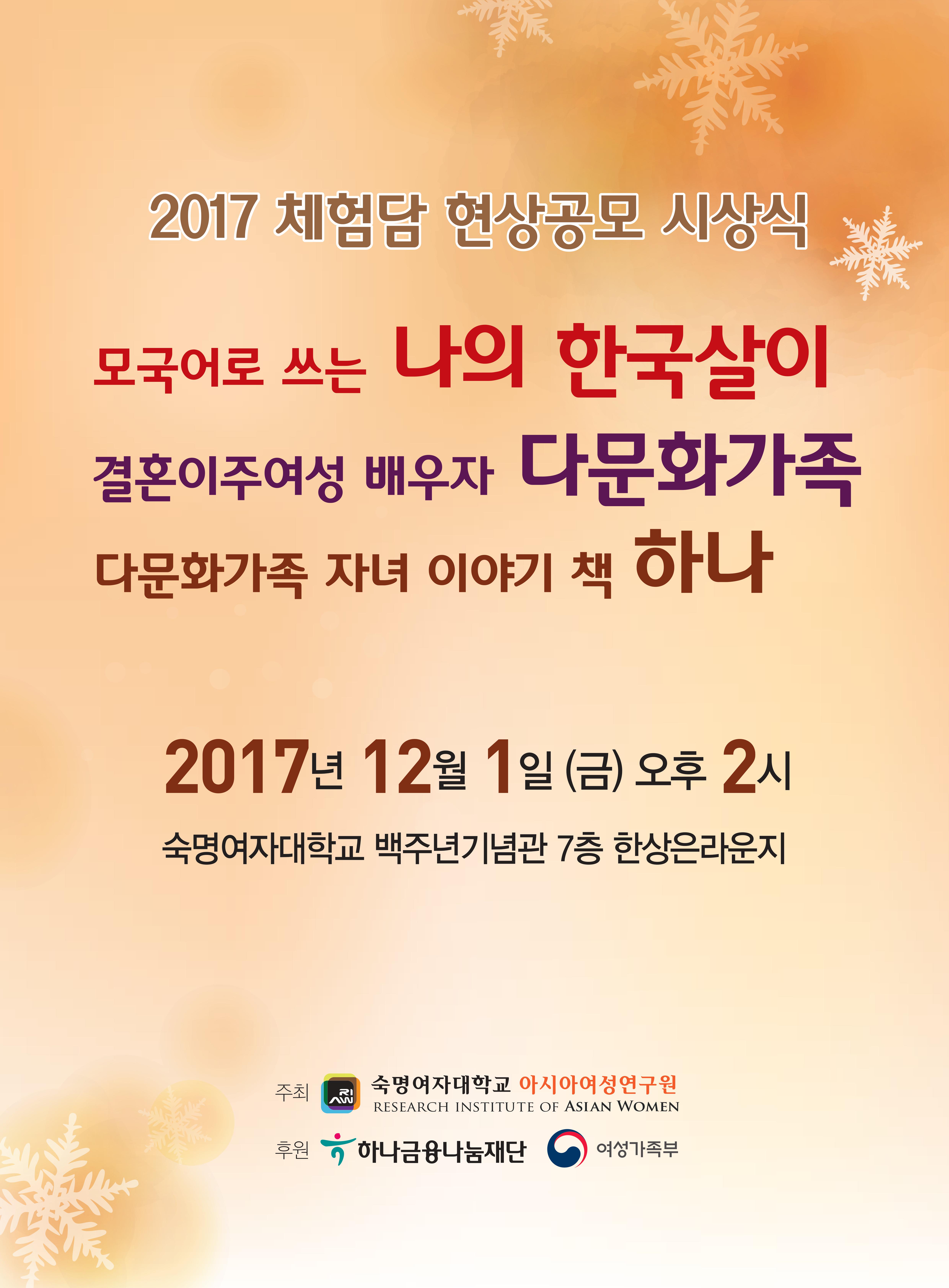 숙명여자대학교 아시아여성연구원에서는 지난 2007년부터 <결혼이주여성 모국어로 쓰는‘나의 한국살이’체험담 현상공모> 사업을 수행한 바 있습니다. 2017년에는 <모국어로 쓰는 '나의 한국살이' 체험담> 현상공모 뿐만 아니라 <결혼이주여성 배우자 '다문화가족' 체험담>, <다문화가족 자녀 이야기책 ‘하나’ 만들기> 현상공모전까지 확대 실시하였습니다.