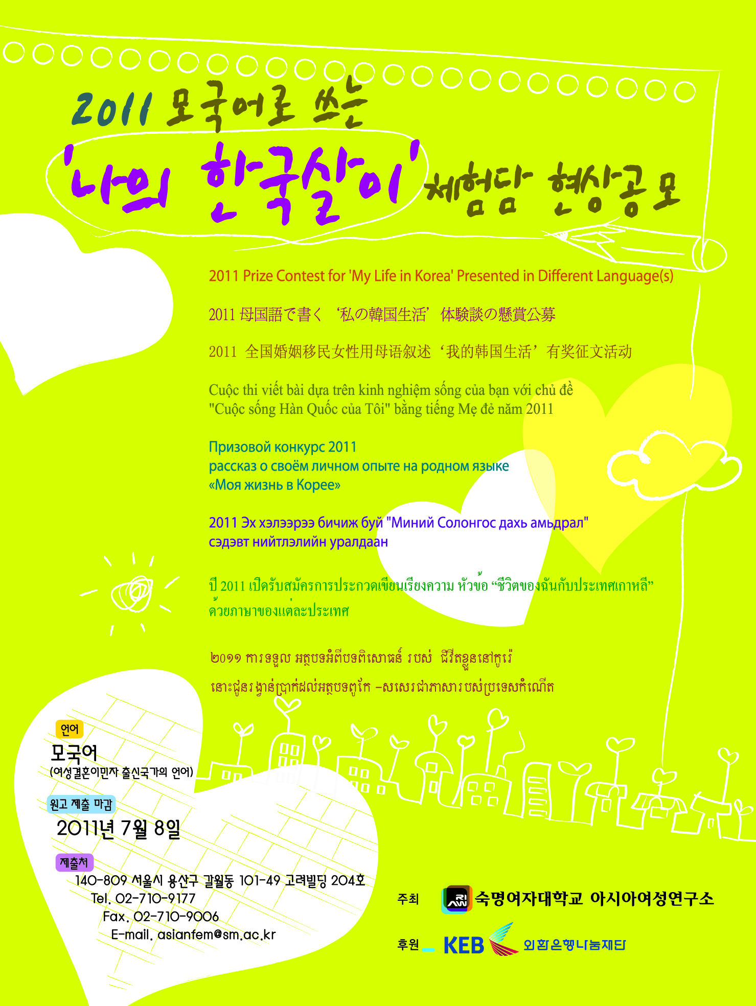 숙명여자대학교 아시아여성연구소에서는 외환은행나눔재단 지원으로 여성결혼이민자 여러분의 모국어로 쓰는'나의 한국살이'체험담을 현상 공모합니다. 여성결혼이민자분들의 많은 관심과 참여를 부탁드립니다.
