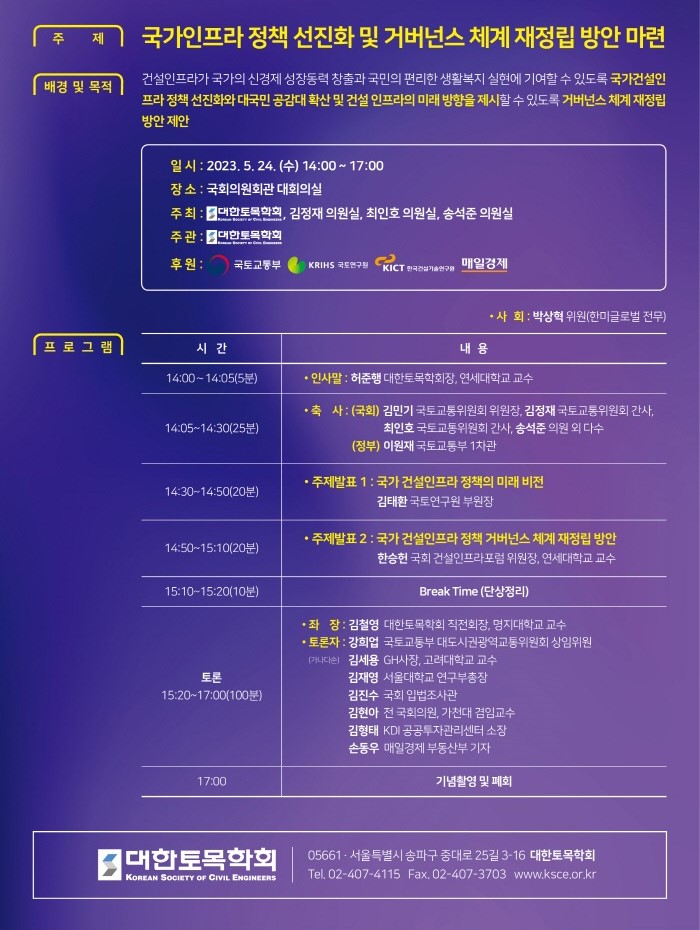 [대한토목학회] 제2회 국회 건설인프라포럼 '국회인프라 정책 선진화 및 거버넌스 체계 재정립 방안 마련'