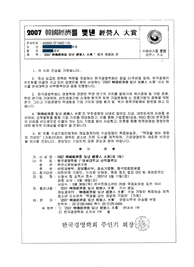 첨부해 드리는 '2007 韓國經濟를 빛낸 經營人 大賞' 문서는 한국경영학회에서 발송한 공문이 아님을 알려드립니다.