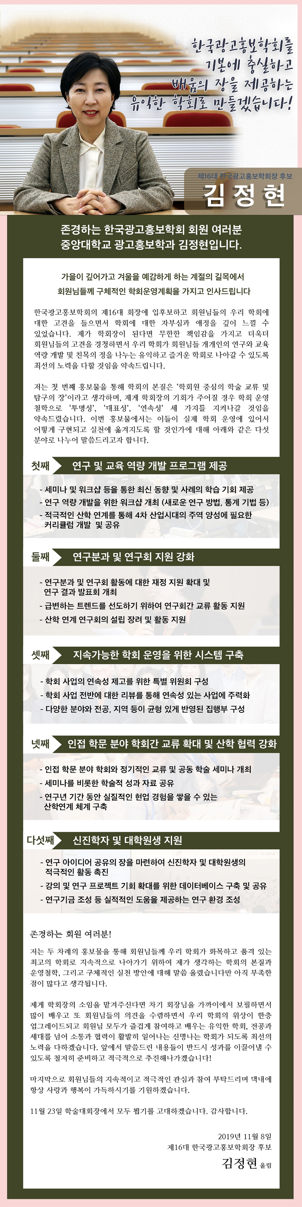 오는 11월 23일 개최되는 한국광고홍보학회 가을철 정기학술대회에서 실시하는 제16대 한국광고홍보학회 회장 선거의 제2차 홍보물을 안내드립니다.
