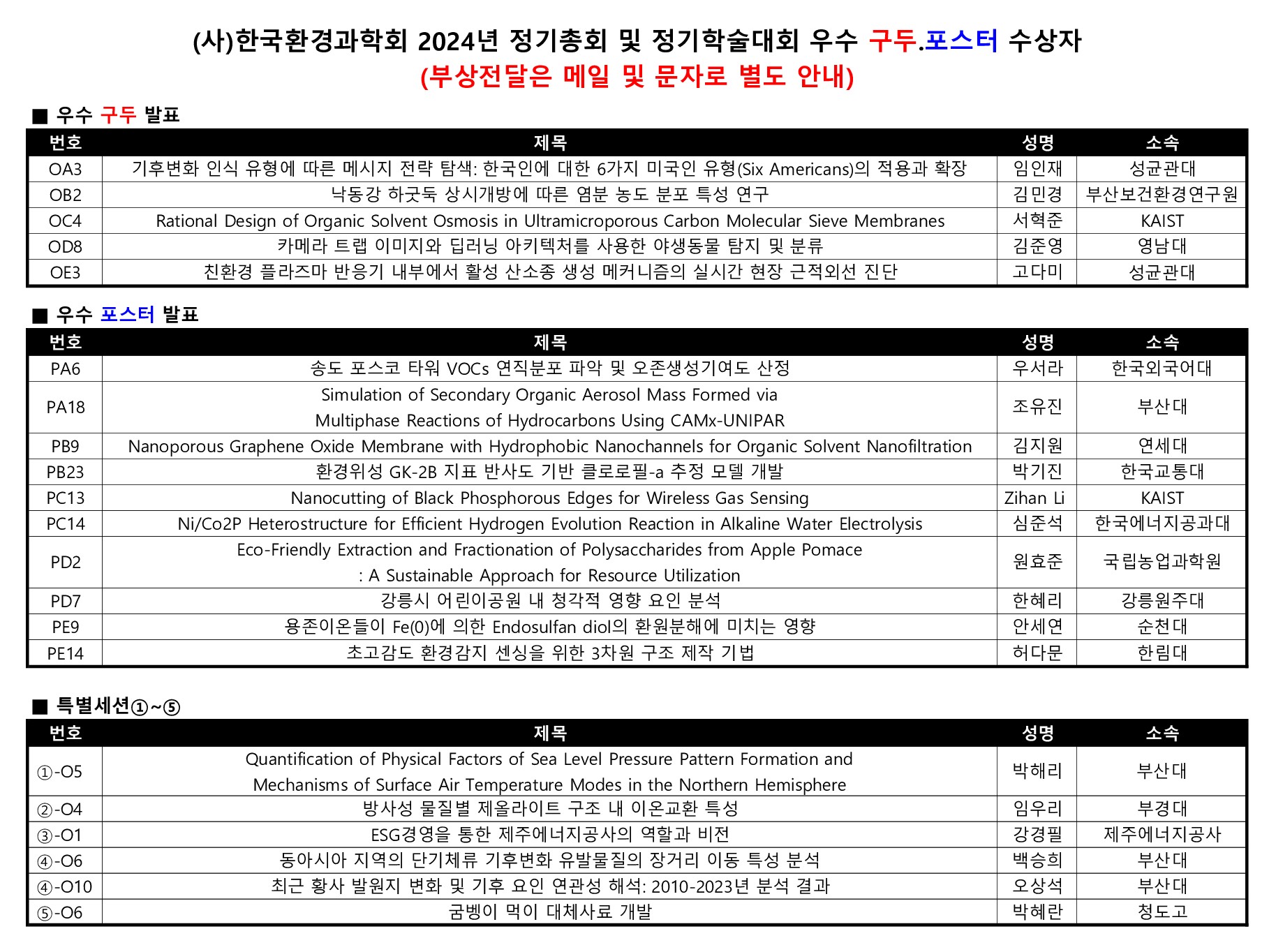 2024년 정기학술대회 우수구두,포스터 수상자 안내