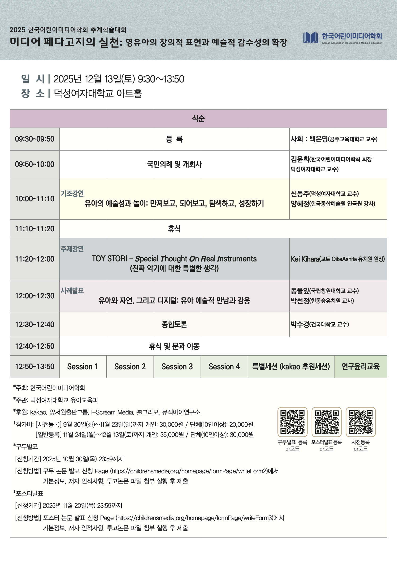 이번 추계학술대회는 ‘미디어 페다고지의 실천: 영유아의 창의적 표현과 예술적 감수성의 확장’이라는 주제로 학계 및 현장 전문가를 모시고 학문적⸱실천적 배움과 공유의 즐거움을 나누는 장을 마련하고자 합니다.