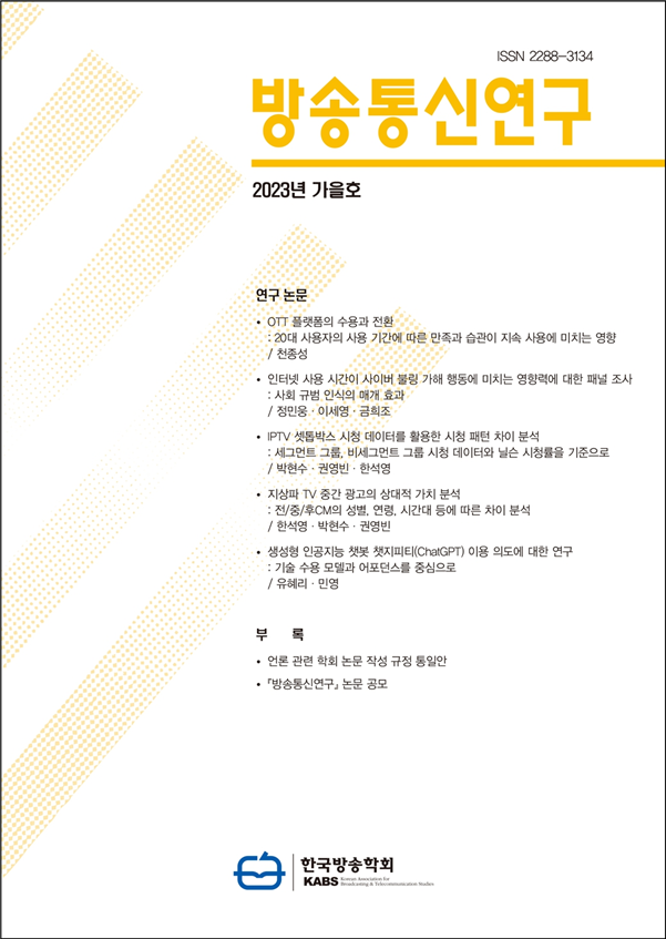 3. <방송통신연구> 2023년 가을호(통권 제124논문은 방송학회 홈페이지의 논문통합검색에서 논문을 내려받아 읽으실 수 있습니다.