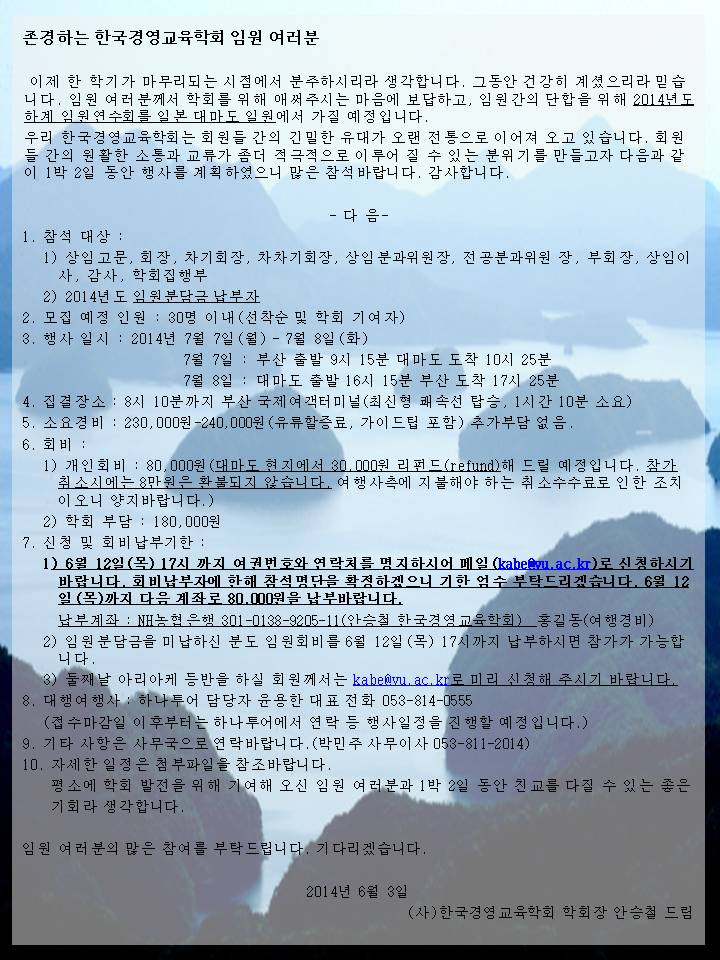 2014 하계 상임이사 연수회 공지 및 신청안내