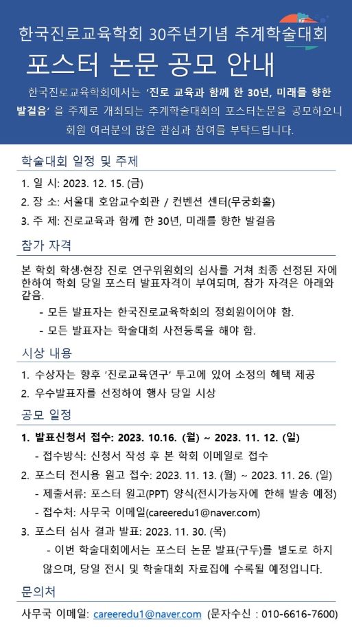 '진로교육과 함께 한 30년, 미래를 향한 발걸음'이라는 주제로 30주년 기념 추계학술대회를 개최할 예정입니다.