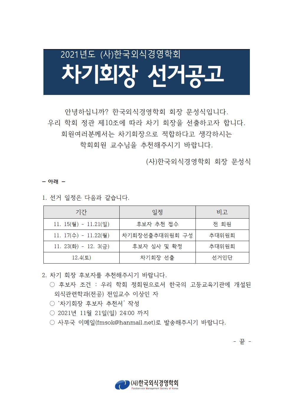 2021년도 (사)한국외식경영학회 차기회장 선거공고