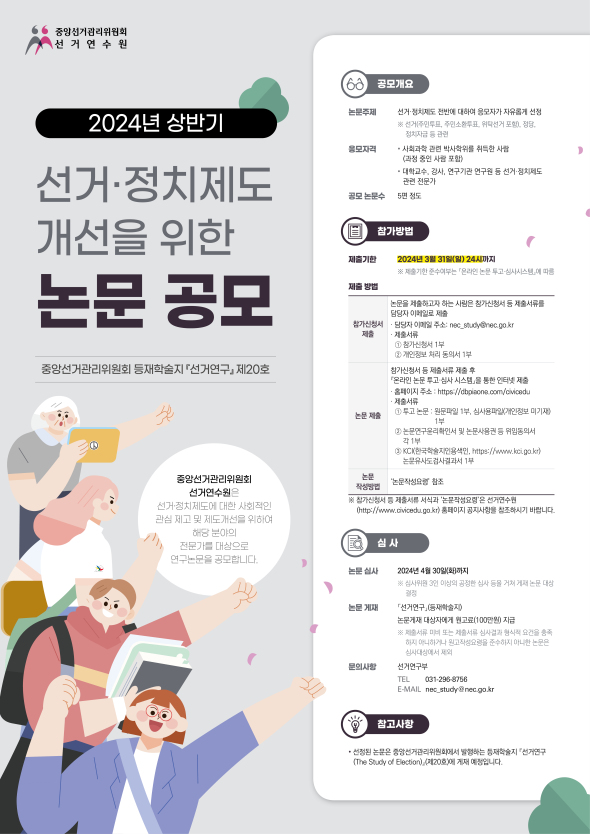 중앙선거관리위원회 선거연수원은 선거·정치제도에 대한 사회적인 관심 제고 및 제도 개선을 위하여 아래와 같이 해당 분야의 전문가를 대상으로 연구논문을 공모합니다.
