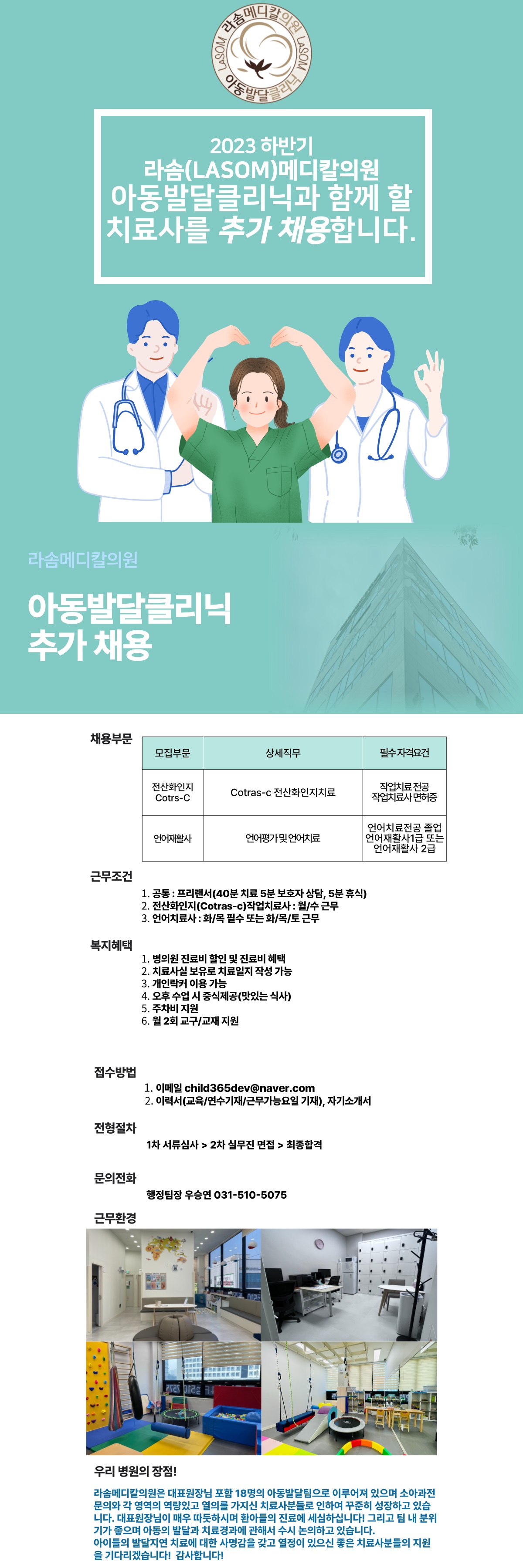 라솜메디칼의원에서는 아이들을 사랑하고 열정이 넘치며 배우고자 열의가 있으신 언어재활사, 전산화인지치료사 선생님을 모시고자 하오니 많은 지원을 부탁드립니다.