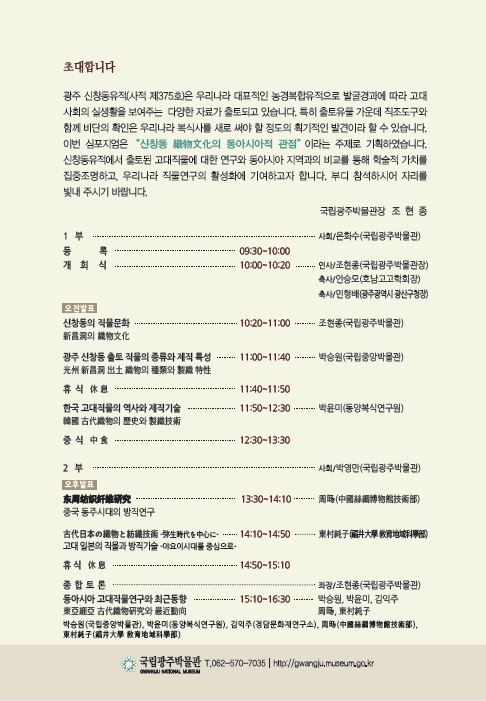 이번 심포지엄은 '신창동 織物文化의 동아시아적 관점이라는 주제로 기획하였습니다. 신창동유적에서 출토된 고대직물에 대한 연구와 동아시아 지역과의 비교를 통해 학술적 가치를 집중조명하고, 우리나라 직물연구의 활성화에 기여하고자 합니다. 부디 참석하시어 자리를 빛내 주시기 바랍니다.