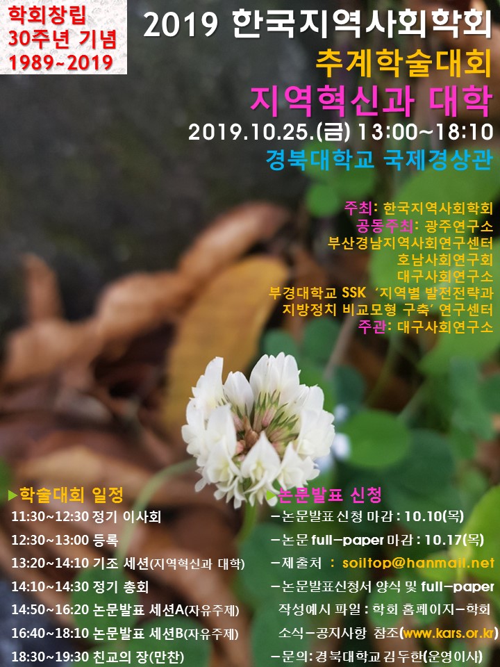 2019년 한국지역사회학회 <추계학술대회 및 정기총회> 개최 안내(10월 25일(금), 경북대학교)
