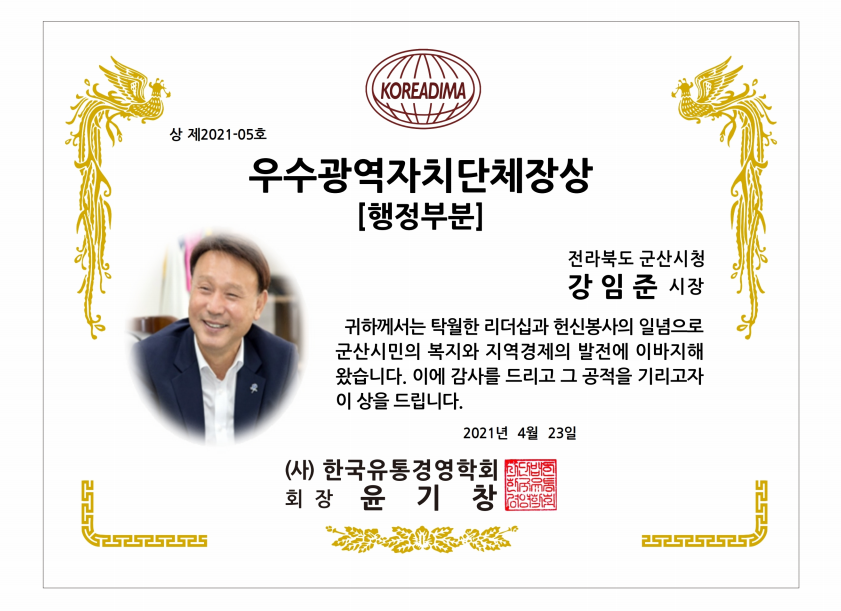- 우수광역자치기관장상(행정부분): 전라북도 군산시청 강임준 시장