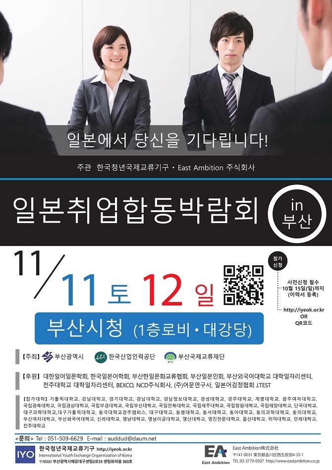 本日どもが後援をしております日本就職共同博覧会 in 釜山主催釜山広域市産業人力公団主管韓国青年国際交流機構 下記のとおり開催いたしますので案内申げます
