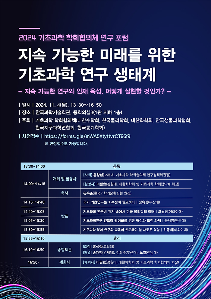 2024년 기초과학 학회협의체 두 번째 포럼으로 연구 포럼이 아래와 같이 개최될 예정입니다.
