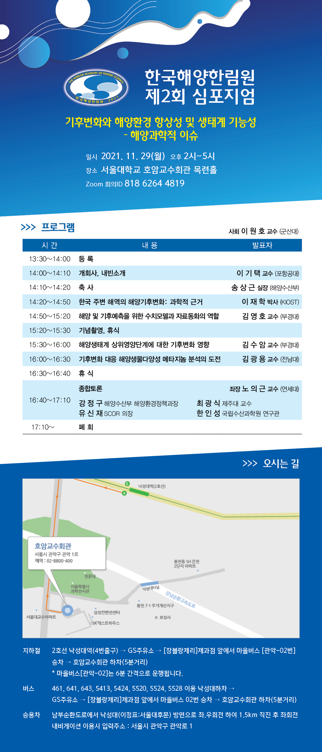 ()한국해양한림원(회장이기택 포항공대 교수)은 지난 7월 공식 발족한 이래창립기념 심포지엄(주제탄소중립 실현을 위한 해양학의 역할, 2021. 09. 30), 1회 정기 심포지엄(주제탄소중립과 블루카본, 2021. 10.29)을 개최했고향후 지속적으로 해양과학과 정책에 대한 활발한 토론의 장을 마련할 예정입니다.