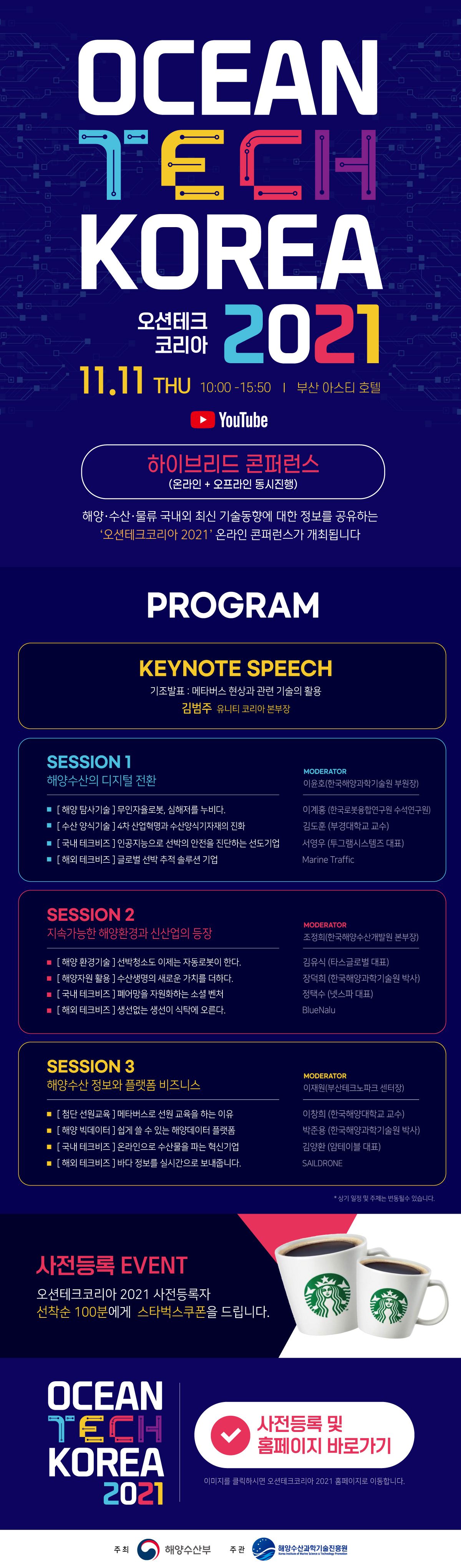 본 행사는 세가지 주제의 세션과 기조강연 등 총 13개의 강연으로 구성되어 있으며국내외 연사들과 최신 기술 동향 및 사례를 공유하며 해양 수산과 관련된 혁신 기술 등 좋은 네트워킹의 자리가 될 것으로 생각됩니다