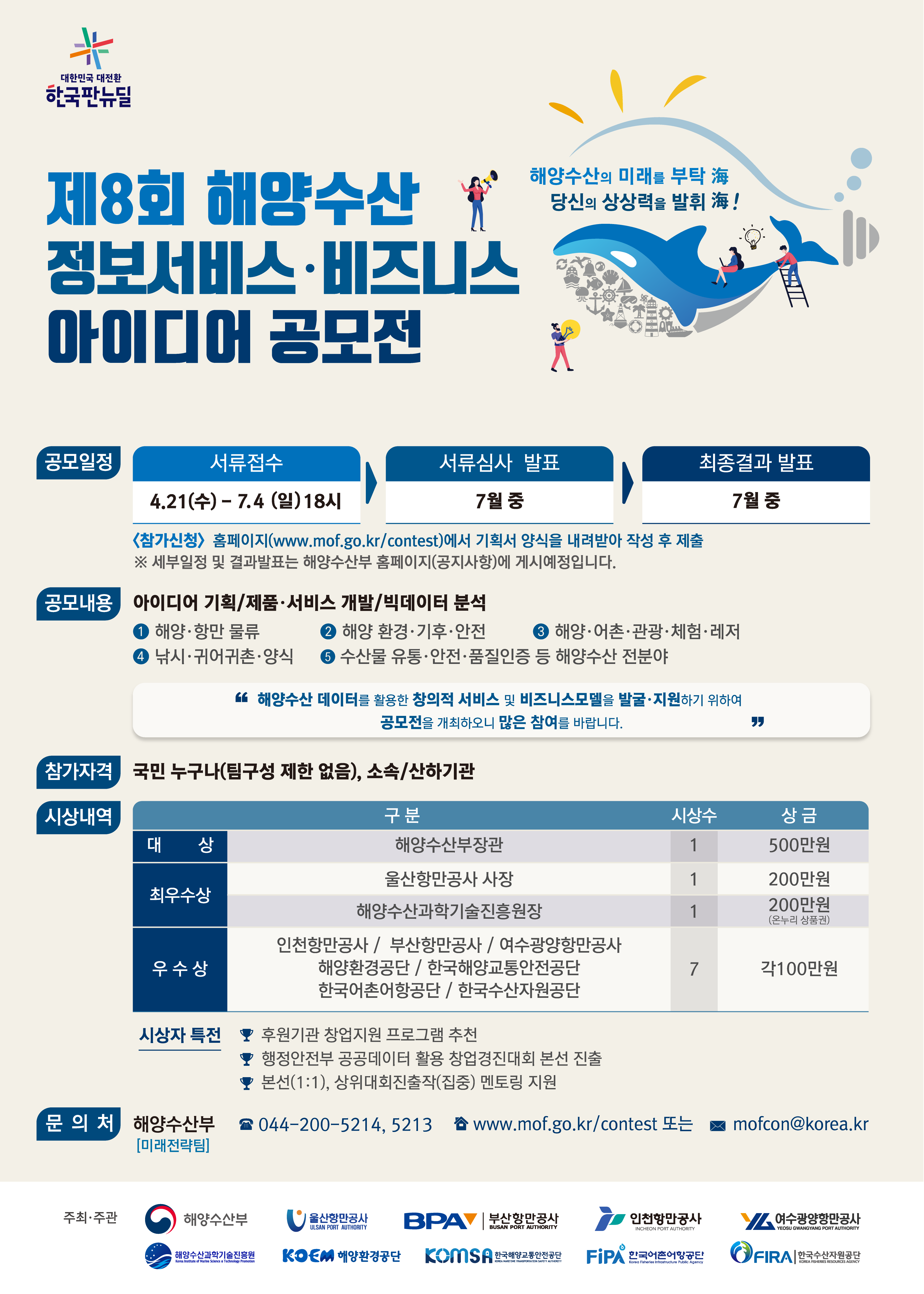 해양수산부 주최로 해양수산 데이터 기반의 창의적인 비즈니스모델 및 행정서비스 아이디어를 발굴· 지원하기 위하여 제8회 해양수산 정보 서비스· 비즈니스 아이디어 공모전을 개최합니다.