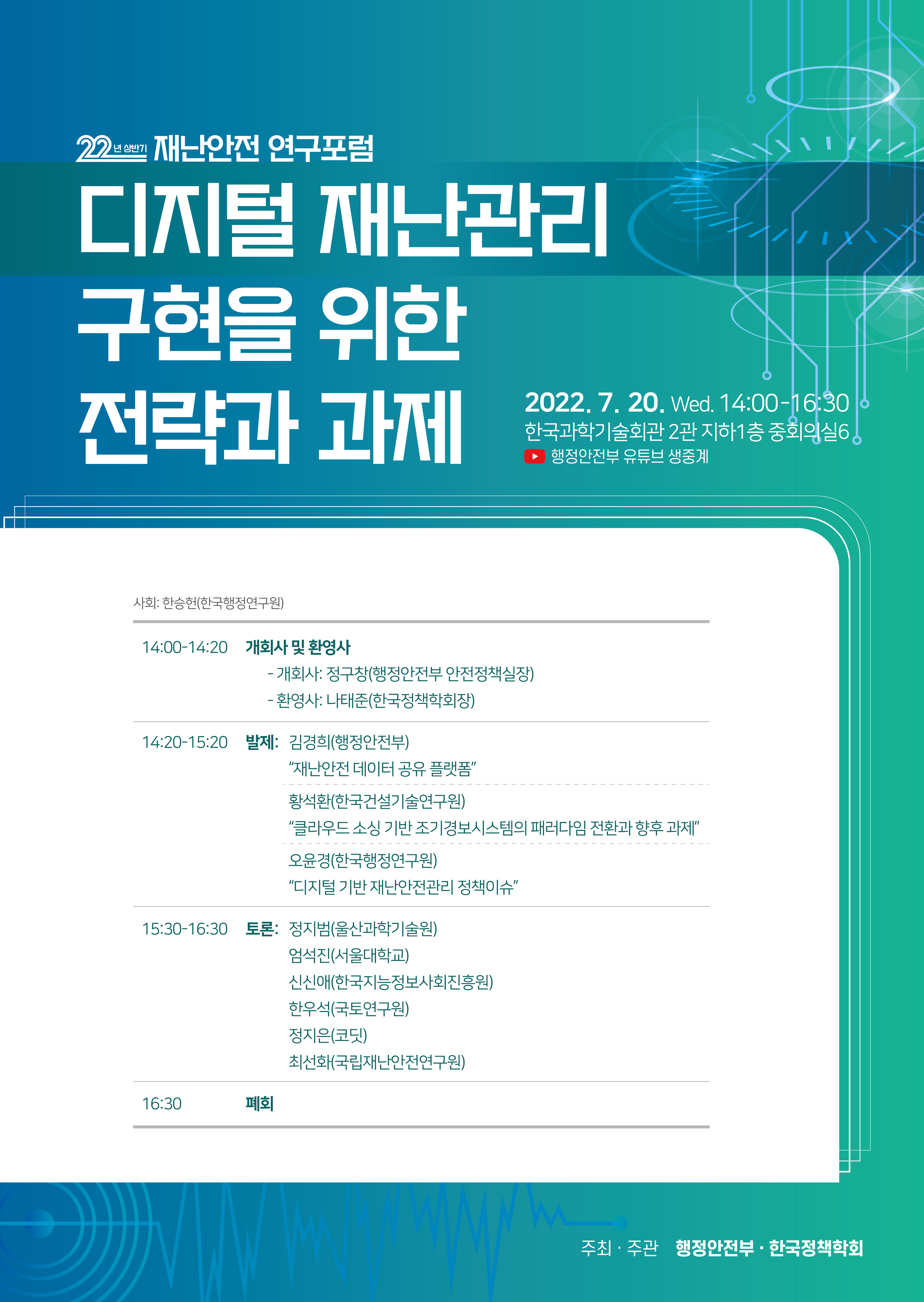 [한국정책학회] "22년 상반기 재난안전 연구포럼: 디지털 재난관리 구현을 위한 전략과 과제"를 행정안전부와 함께 개최합니다.