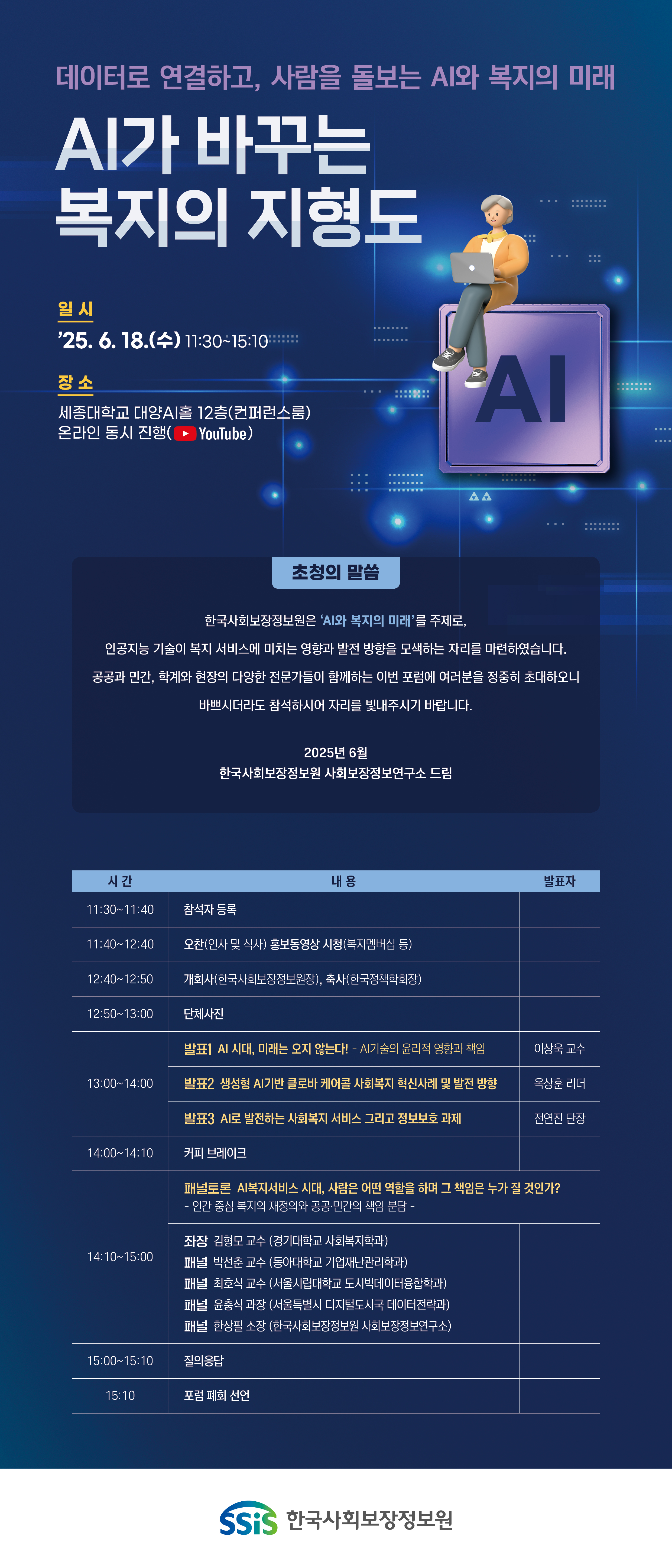 『데이터로 연결하고, 사람을 돌보는 AI와 복지의 미래』라는 주제로 사회보장정보연구소 포럼을 개최합니다.