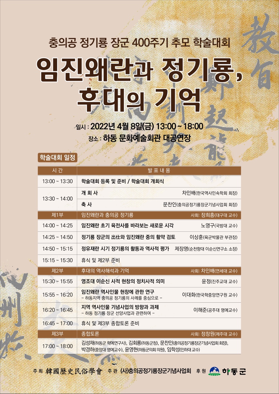 2022년 4월 8일 제 254차 월례발표회 및 충의공 정기룡 장군 400주기 추모 학술대회 안내