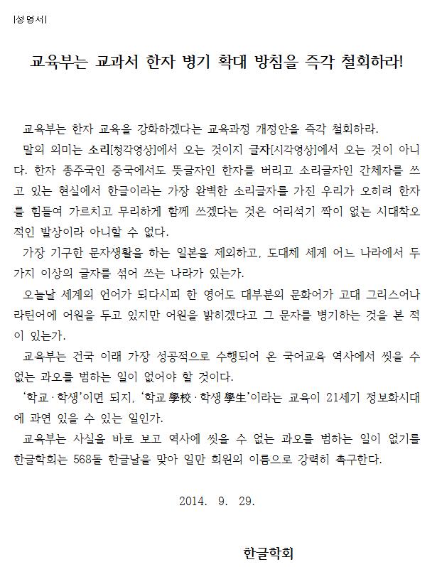 [성명서] 교육부는 교과서 한자 병기 확대 방침을 즉각 철회하라!