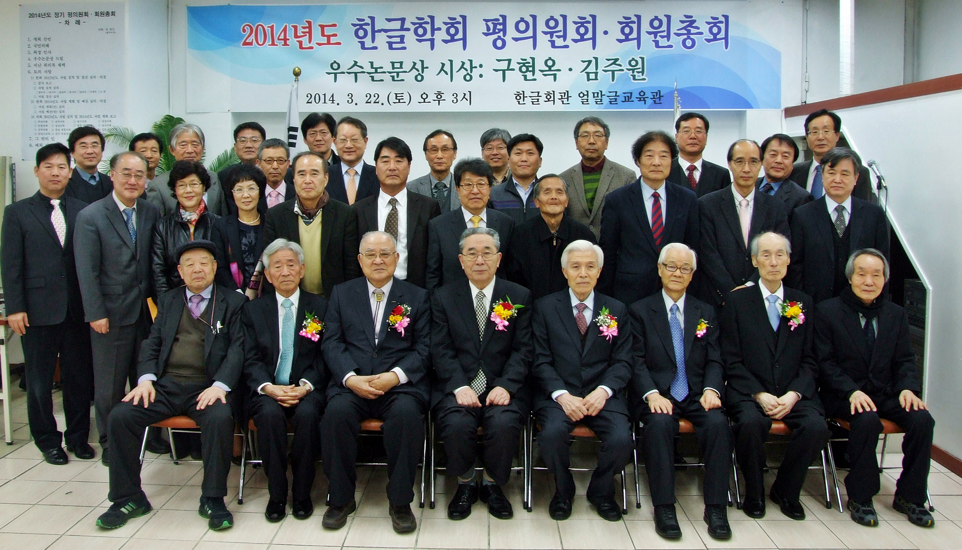 한글학회는 2014년 3월 22일(토) 오후 3시에 한글회관 얼말글교육관에서 아래와 같이 2014년도 정기 평의원회와 회원총회를 엽니다. 아울러 이번 회원총회에서 2013년도 우수논문상 시상도 함께 합니다. 회원 여러분께서는 모두 오셔서 학회 운영에 대한 좋은 의견을 나누어 주시고 우수논문상 수상자들에게도 격려와 축하를 바랍니다.