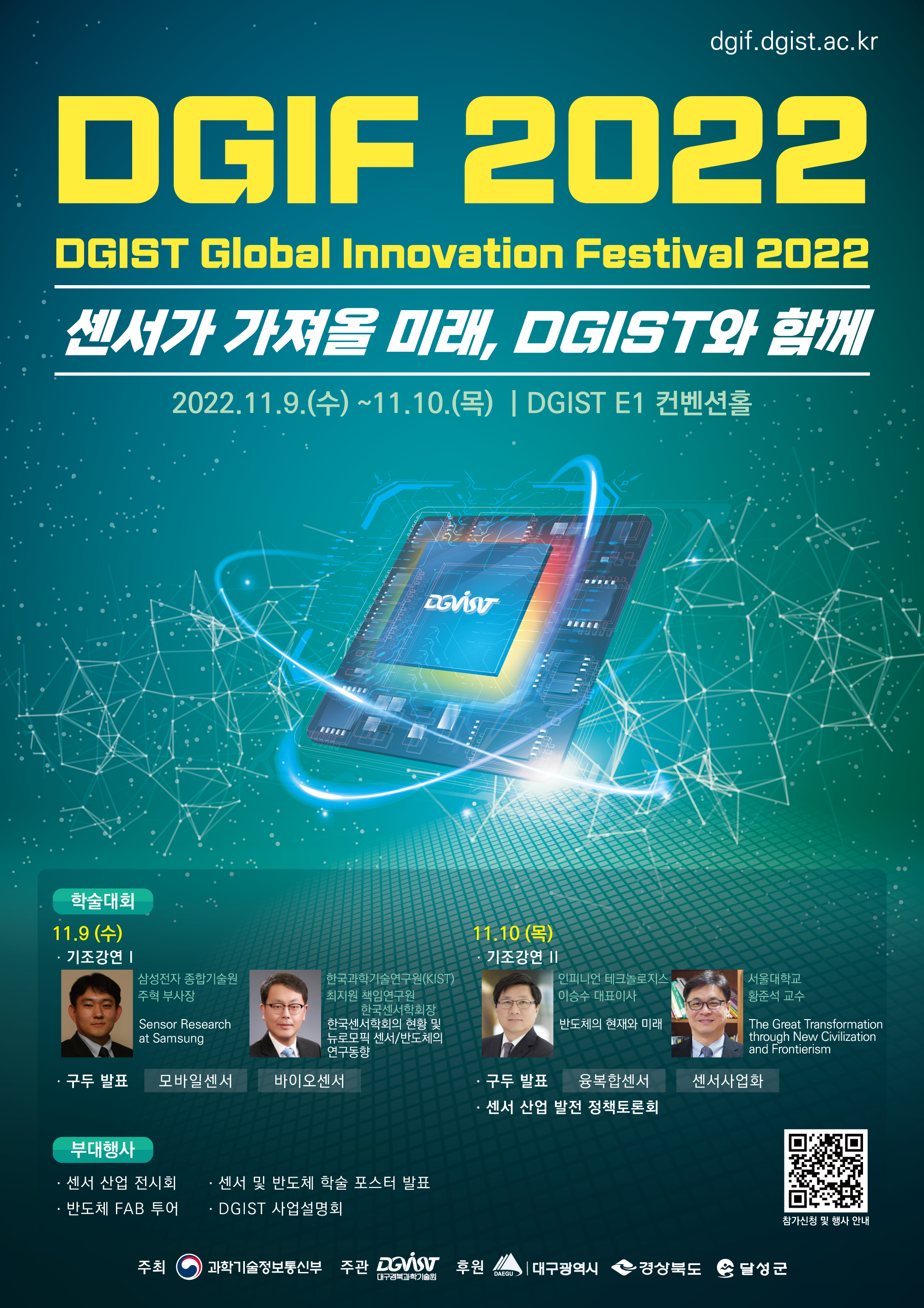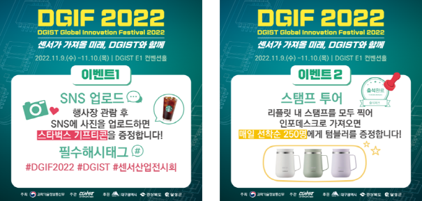 1. DGIST(대구경북과학기술원)에서는 매년 DGIF(DGIST Global Innovation Festival) 행사를 개최하고 있으며, 2022년에는 센서와 반도체를 주제로 11월 9일(수)~10(목)에 개최합니다.