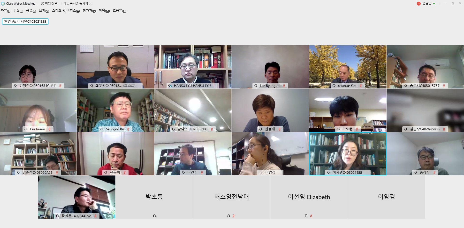 2020년  12월  5(러시아연구소 (소장 표상용 노어과 교수 ) HK+연구사업단은 인문한국 프로젝트 (아젠다 러시아 인문공간의 재인식 러시아 속의 세계 세계 속의 러시아 학술 활동의 일환으로 국내학술회의를 개최했다 이번 학술회의는 코로나  19 확산으로 인해 온라인 (Webex)회의로 전환되어 진행됐다 .