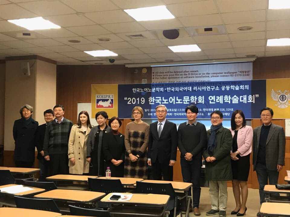 2019 년  11 월  9 ( ) 13:30~18:30  한국외국어대 러시아연구소는 서울캠퍼스 본관  328, 329 호에서 한국노어노문학회와 공동으로 국내학술회의를 개최했다 이번 학술회의에서는 러시아연구소 소속 연구진이 향후  7 년간 수행할 인문한국 플러스 (HK+)  사업의 아젠다를 주제로 라운드테이블 형식으로 참여해 논의를 진행했다 연구소 연구진은 아젠다의 언구방향에 대해 심층적으로 논의하고 이후 토론자로 참가한 외부 전문가들의 제언을 청취하여 효율적이고 성과 높은 연구 방향을 정립하는 계기로 삼았다 이외에도 노어노문하고히 회원들이 참여하는 세션에서는 국내외 러시아 어문학 전문가들이 현재 국내 러시아학계의 문학 어학 번역의 제 문제를 다양한 주제를 통해 발표했다 .