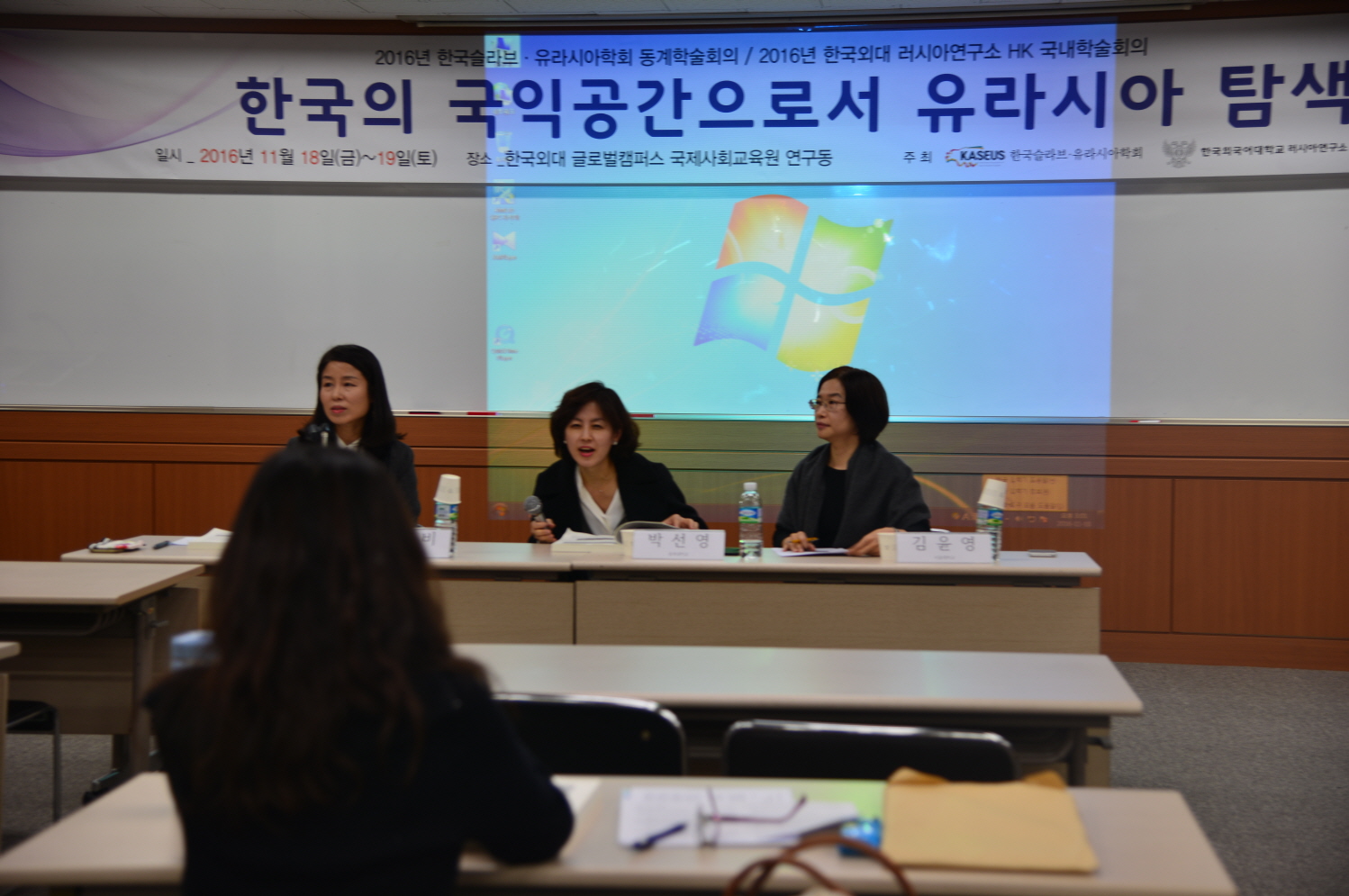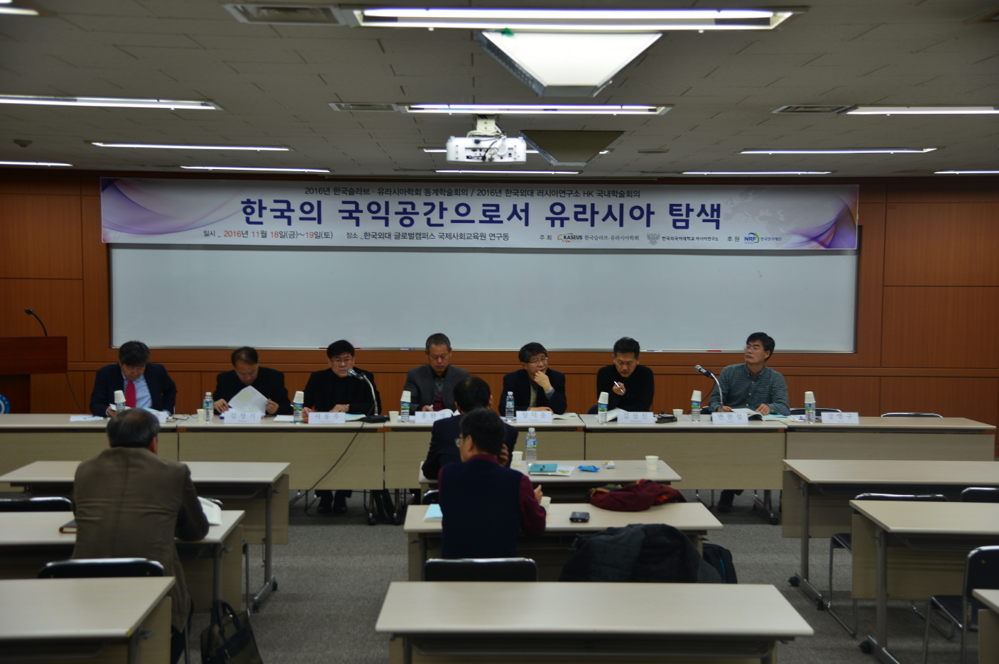 2016 년  11 월  18 ( )~19 ( 이틀에 걸쳐 러시아연구소는 글로벌캠퍼스 국제사회교육원 우덕홀에서 한국 슬라브 · 유라시아학회와 공동으로  한국의 국익 공간으로서 유라시아 탐색 이라는 주제로  HK(Humanities Korea)  국내학술회의를 개최했다 본교 러시아학과 교수인 홍완석 슬라브 · 유라시아 학회장의 축사로 시작된 학술회의에는  12 개 세션을 통해 국내외 러시아 전문가 및 학문후속세대 등 총  36 명이 발표에 참여했고 , 36 편의 논문이 발표됐다 러시아연구소 소속 전임인력들은 인문한국사업  3 단계 세부주제인  러시아 인문공간의 제한성과 잠재력 을 구체화시키는 개별 주제들을 발표했다 김선래 교수는  동북아 경제협력 거버넌스  GTI 의 신현실주의적 분석 ,”  배은경 교수는  “1920 년대 소련 원동고려문단의 초기 형성과정 ,”  최우익 교수는  러시아 북귺권 주민의 사회 · 경제적 변화와 특성 ,”  김혜진 교수는  마리 디아스포라의 이중신앙 ,”  장세호 교수는  러시아 제 7 기 국가두마 선거와 선거제도 개편의 제도효과 ,”  라승도 교수는  포스트소비에트 러시아 영화에 나타난 북극 신화 를 발표했다 .