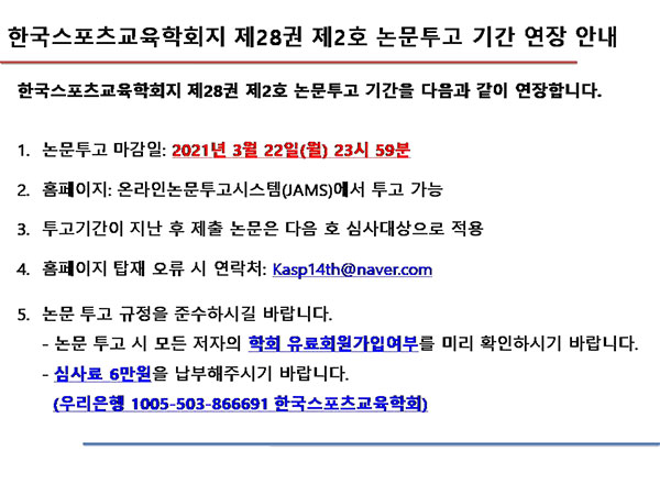 한국스포츠교육학회지 제 28권 2호 논문투고 기간을 다음과 같이 연장합니다.