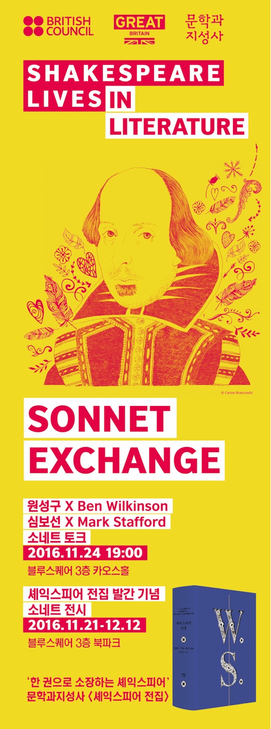 문학과지성사의 국내 최초 셰익스피어 전집 출간을 기념하여, 영국문화원과 문학과지성사가 개최하는 또 하나의 특별한 Shakespeare Lives 행사를 소개합니다. 영국문화원과 문학과지성사가 함께 개최하는 ‘소네트 익스체인지(Sonnet Exchange)’는 한·영 양국의 시인과 웹툰 작가가 한 팀을 이루어 공동으로 셰익스피어 소네트를 한 편 선정하고 그 원작을 바탕으로 새로운 작품을 현대적 시각으로 재창작하는 프로그램입니다. 우리 셰익스피어 학회 회장님께서 축사를 할 예정입니다.