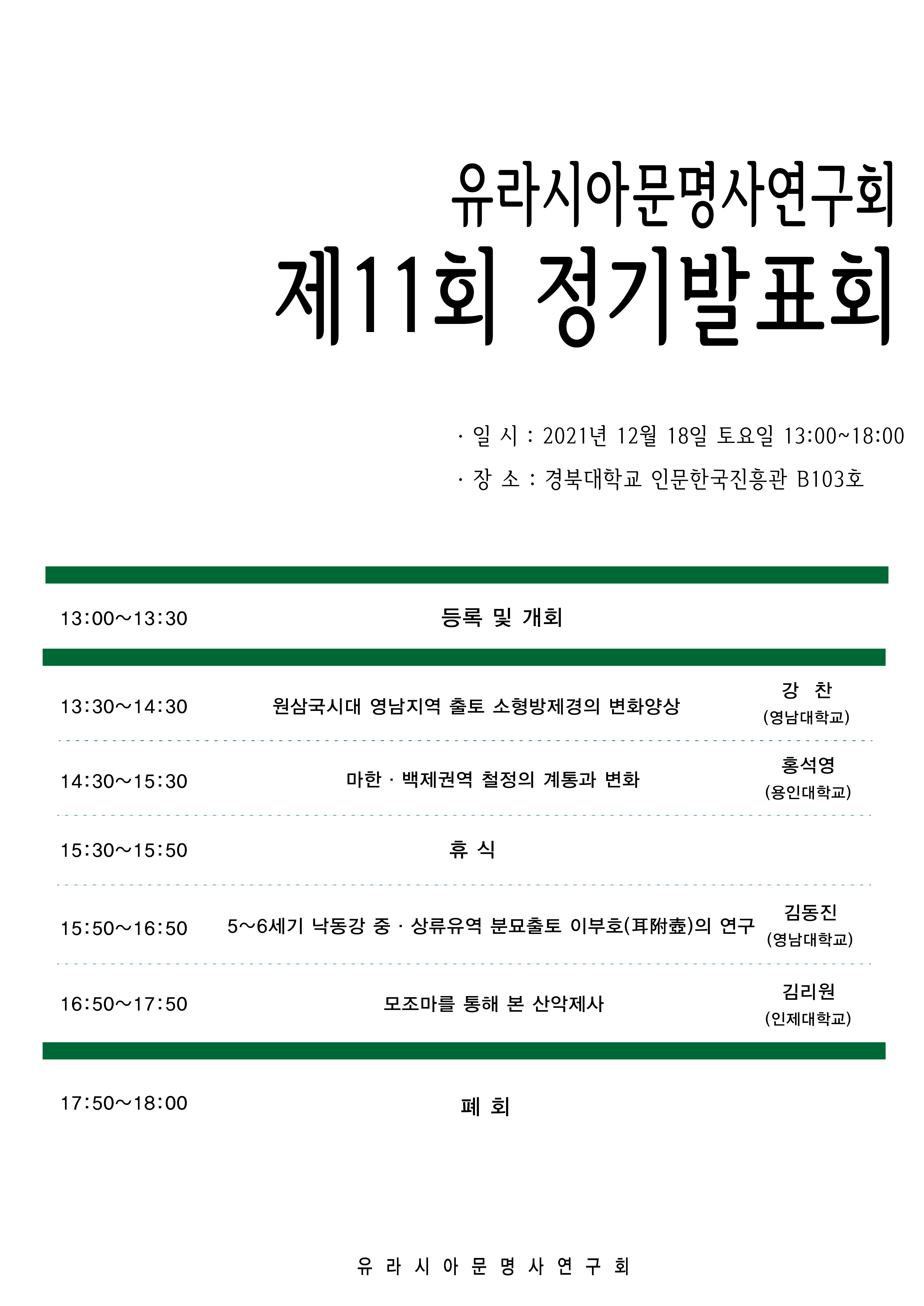 2021년 12월 18일 토요일유라시아문명사연구회 제11회 정기발표회를 개최하고자 합니다여러분의 많은 관심과 참여 부탁드립니다.
