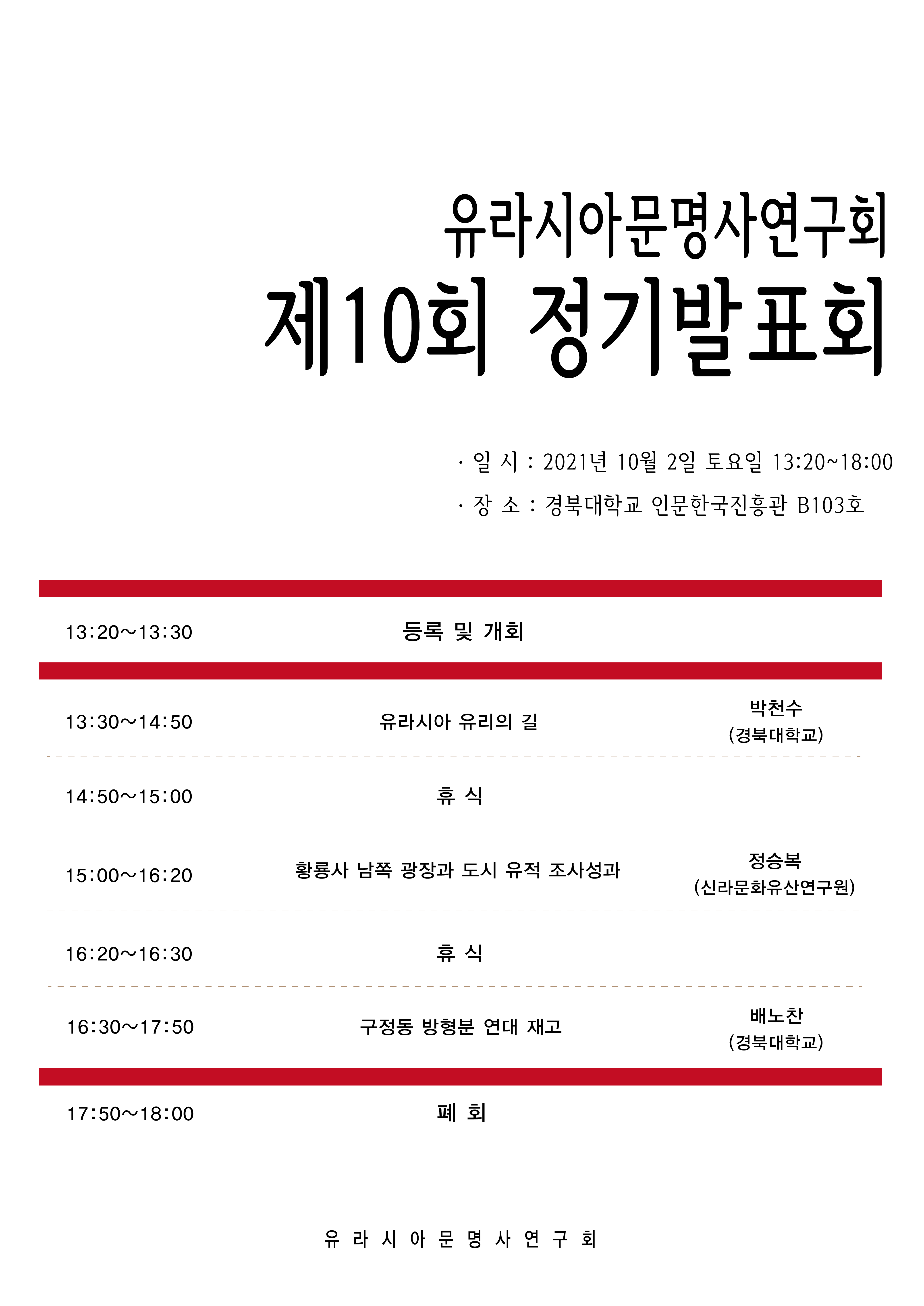 2021년 10월 2일 토요일유라시아문명사연구회 제10회 정기발표회를 개최하고자 합니다.