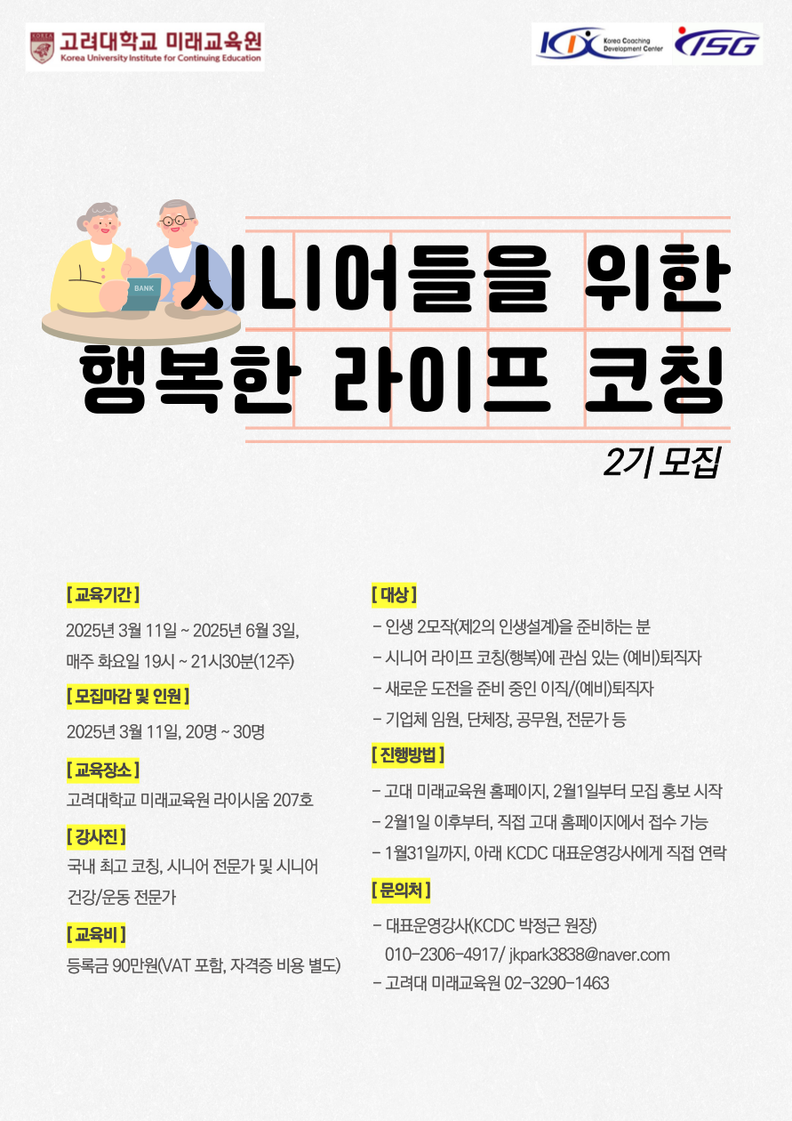 '지역사회 시니어들을 위한 행복한 라이프 코칭' 2기 모집(고려대학교 미래교육원, (사)한국코칭능력개발원)